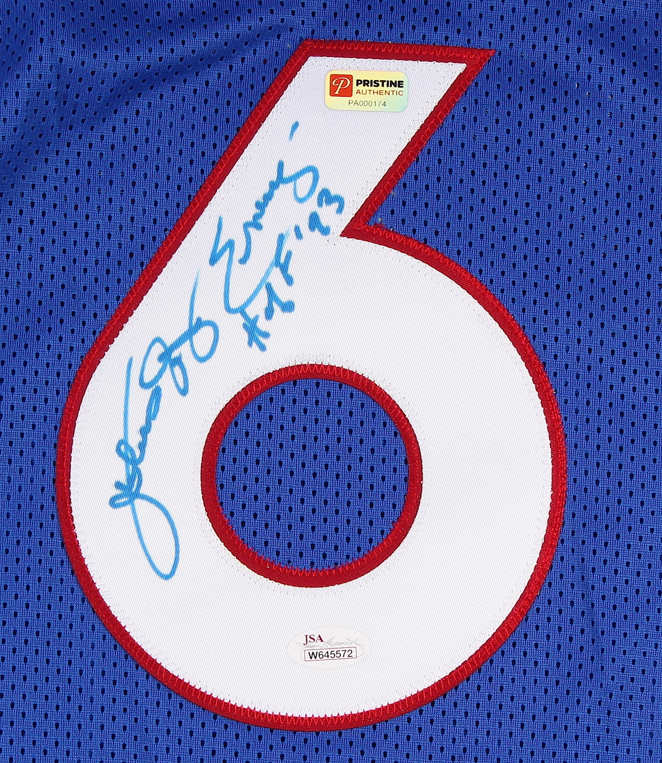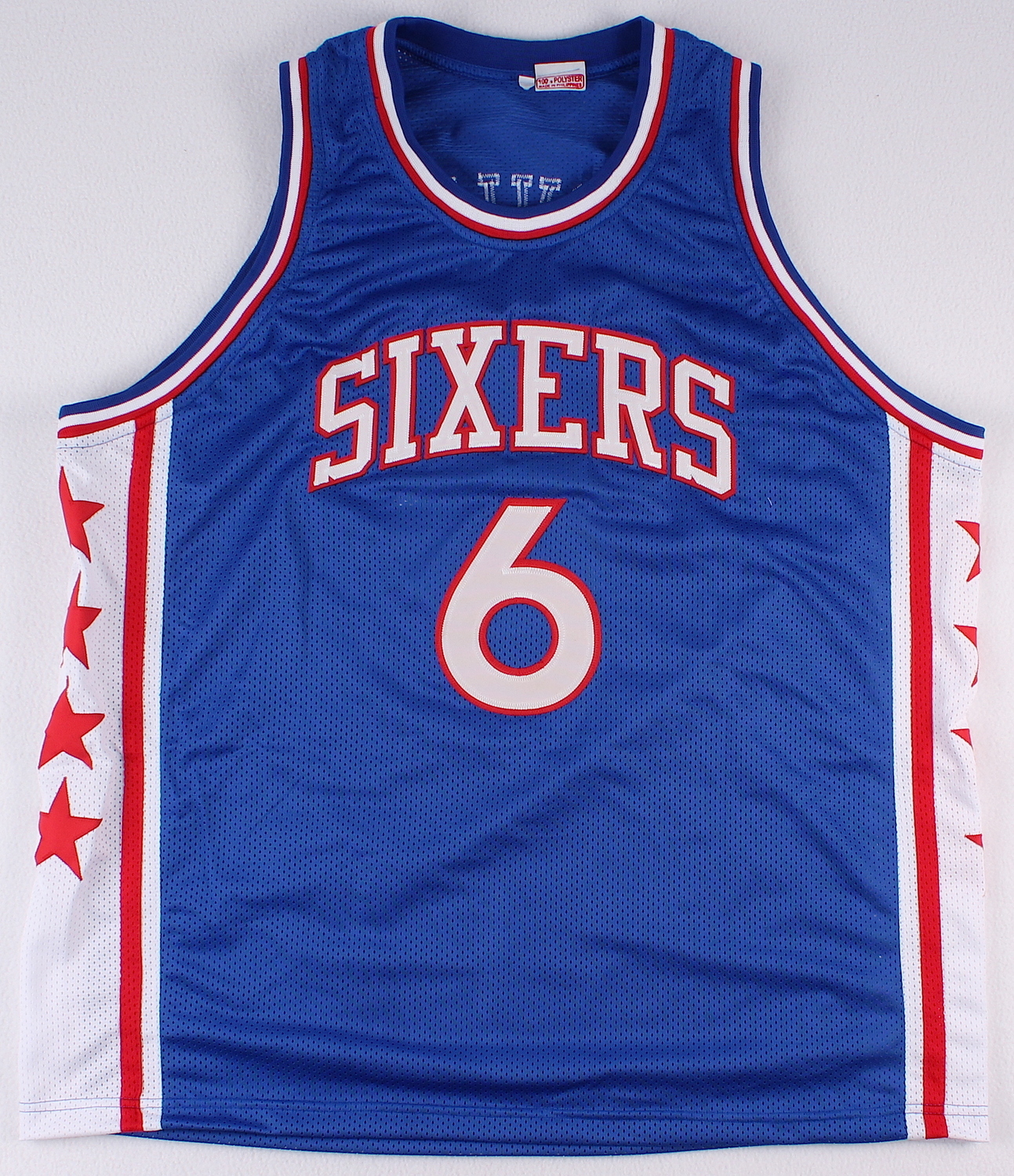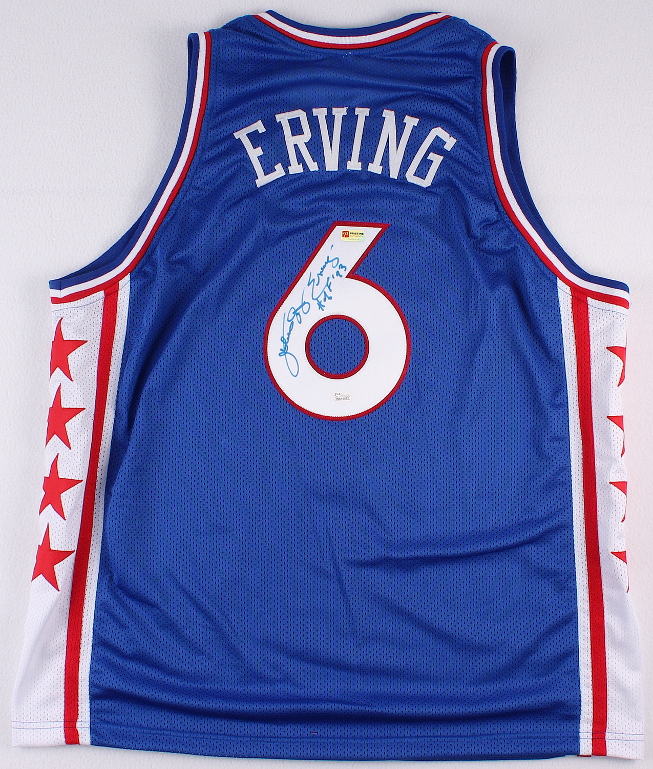 Custom on-court style jersey. Everything sewn on, size XL. Hand-signed and inscribed in blue paint pen by Julius Erving (Nets, 76ers, HOF). Signed Julius "Dr J" Erving. The autograph includes an official James Spence Authentication (JSA) hologram and matching COA for authenticity purposes. Also includes a hologram and COA from Pristine Authentic.