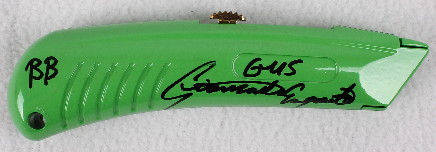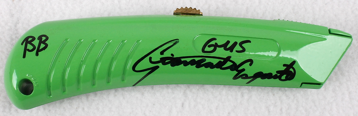 Television Prop Box Cutter. Hand-signed and inscribed in black felt tip pen by Giancarlo Esposito (Breaking Bad). The autograph includes an official Radtke Sports hologram and matching COA for authenticity purposes. Also includes a proof picture from the signing.