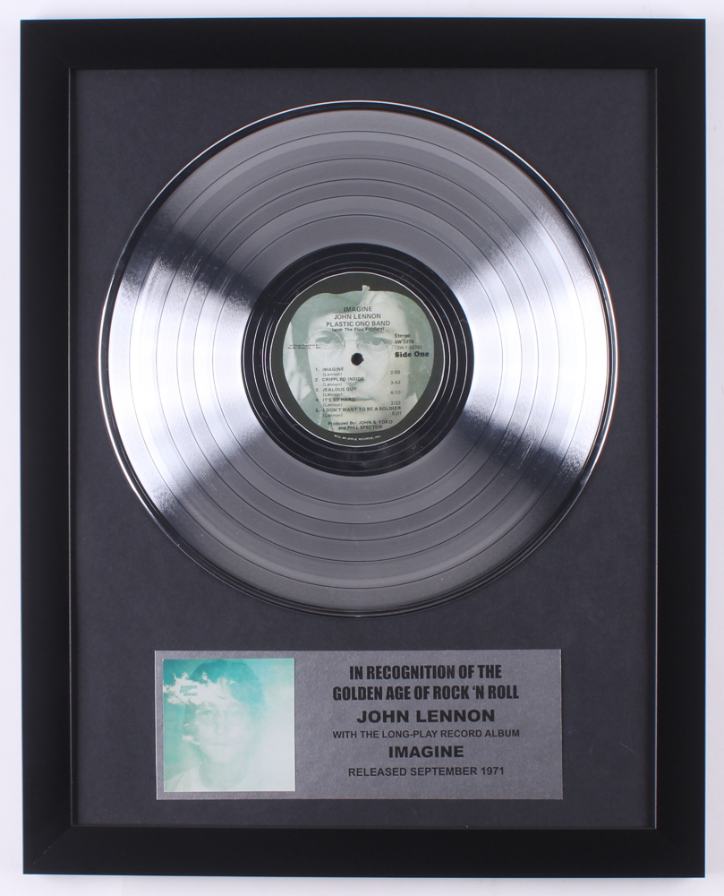 Custom frame measures approximately 15.75" x 19.75" in size. The plaque identifies it as an award presented "to commemorate the sale of more that 1,000,000 copies of the Record Album 'Imagine' released September 1971."