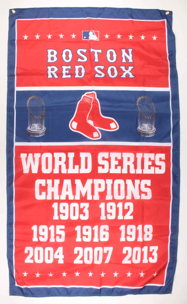 Flag measures 35" x 60" in size and features the Boston Red Sox World Series Championships. See photos for further detail regarding the condition of the flag. Plese note, the flag is not signed.