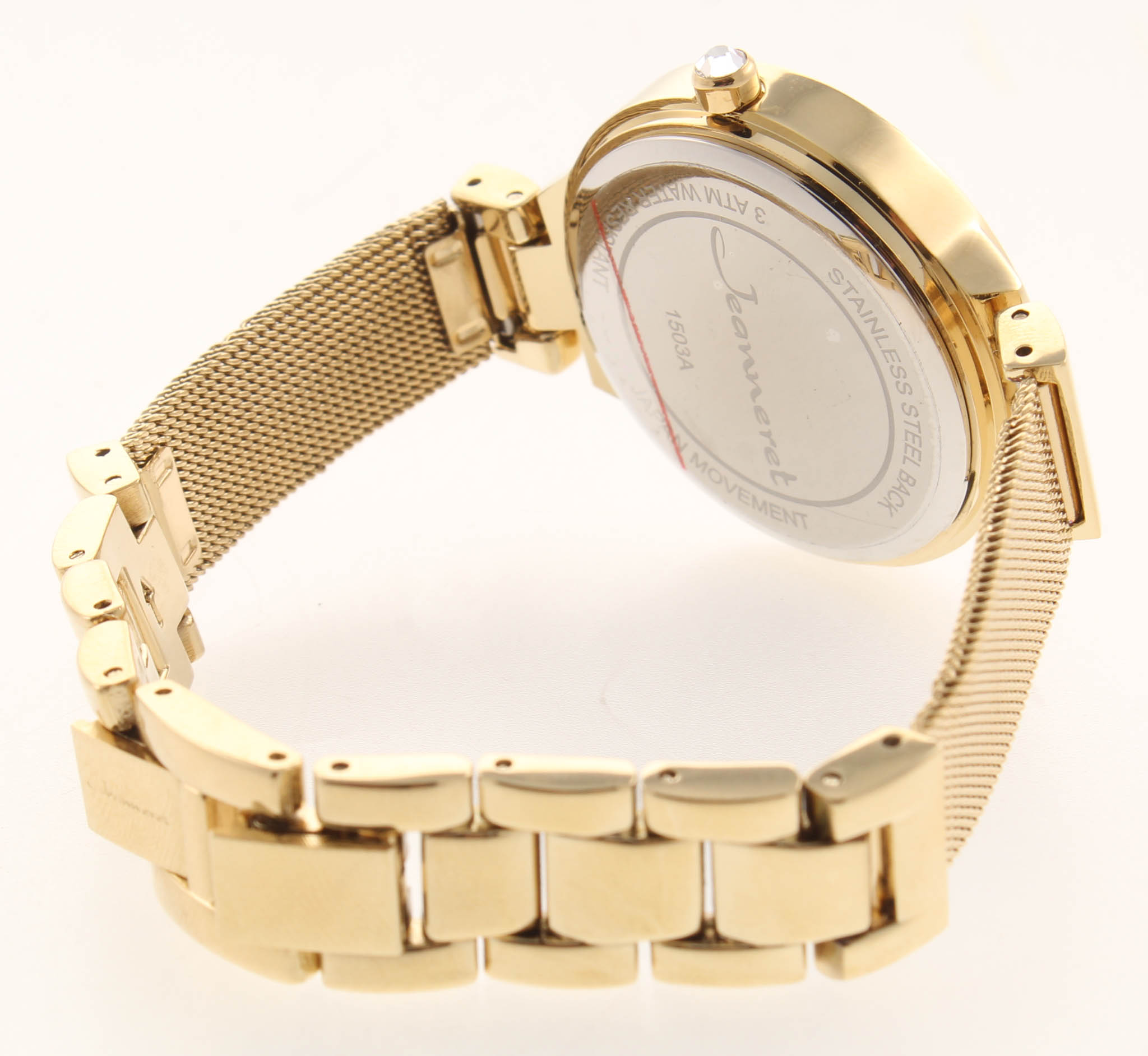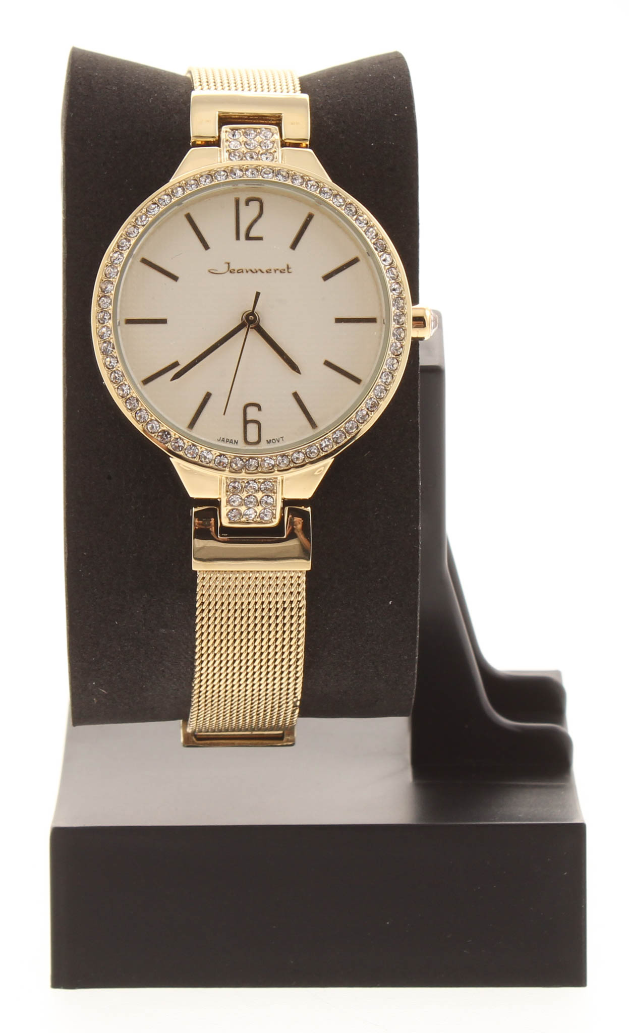 The Jeanneret Jura Ladies Watch features a gold mesh band, gold case, and pearlized eggshell dial. Please see photos for details.