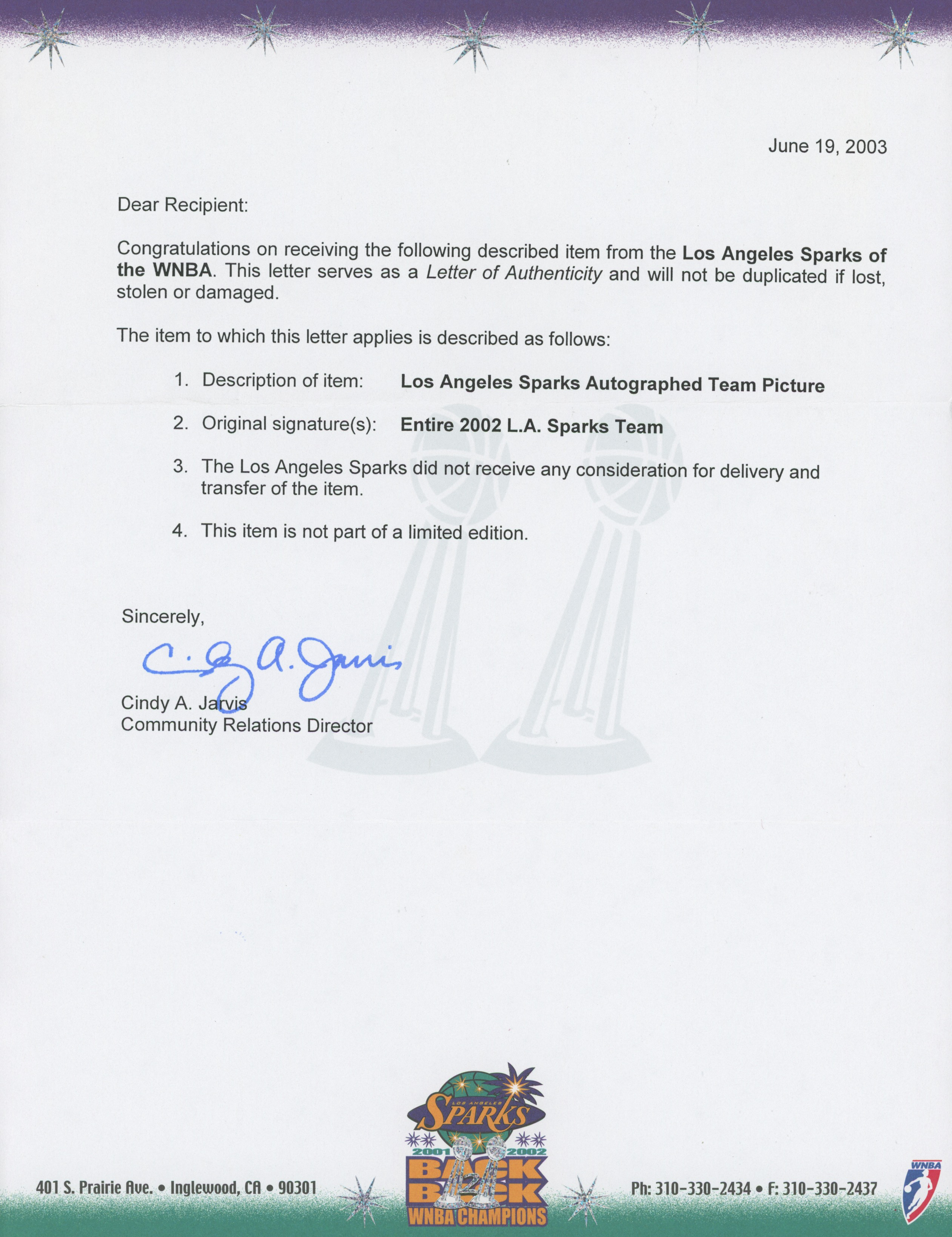 The lot / autograph(s) includes an official Women's National Basketball Association (WNBA) Letter of Authentication for authenticity purposes.