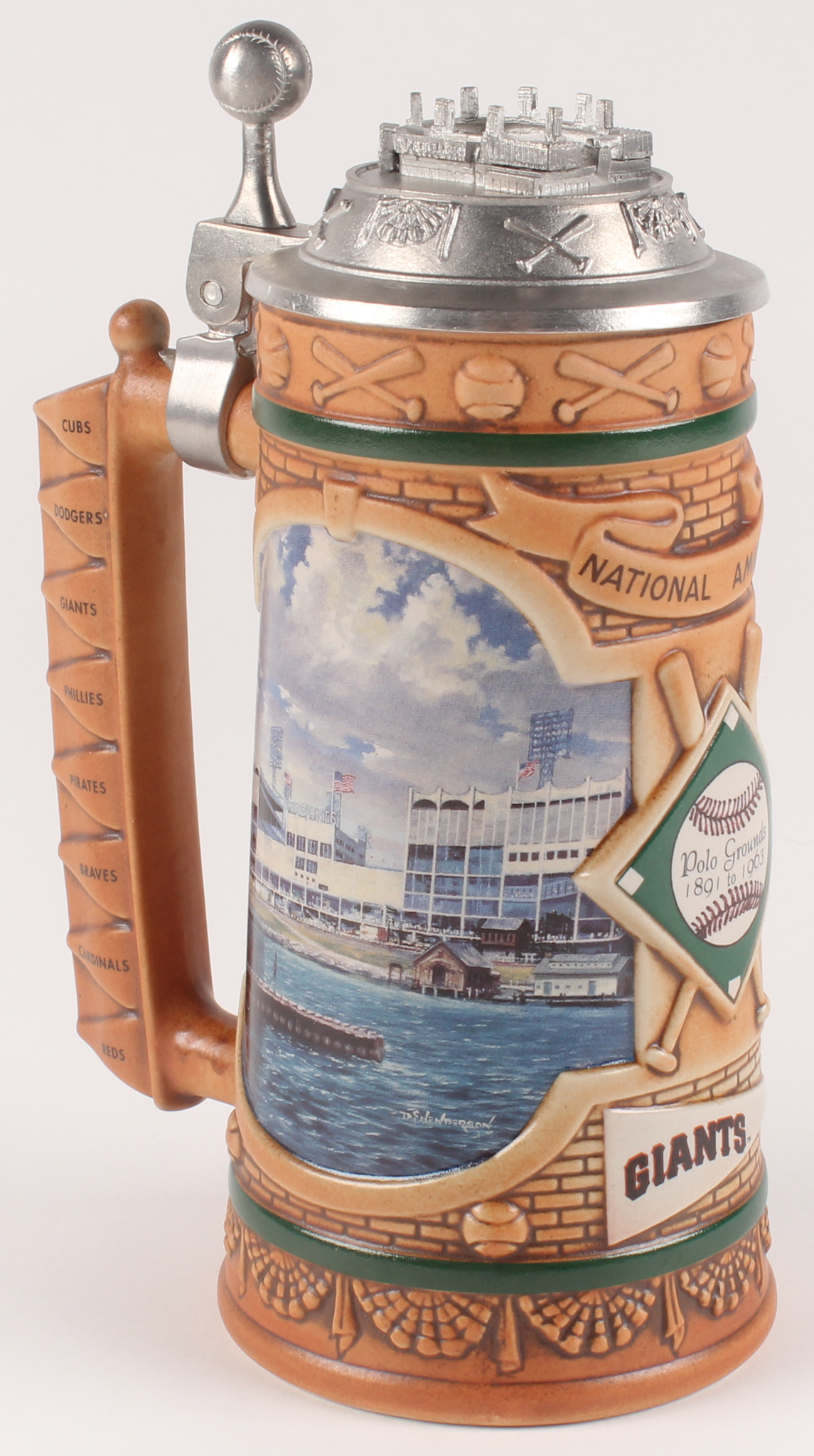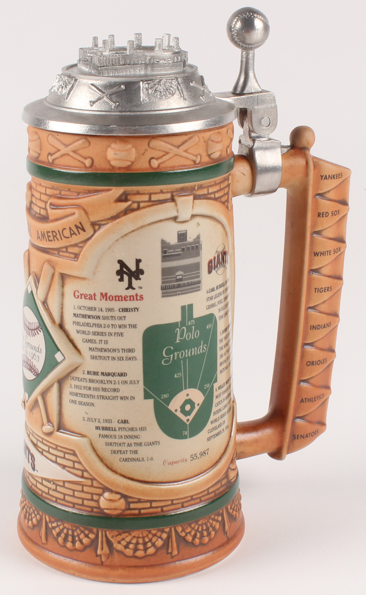 Limited Edition Stein Mug with metal lid measures 7.5" tall and features the Giants history. The mug is limited edition to a limit of 75 firing days, numbered #A0503.