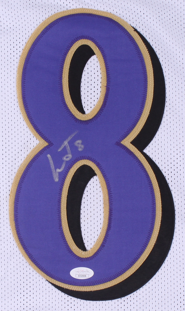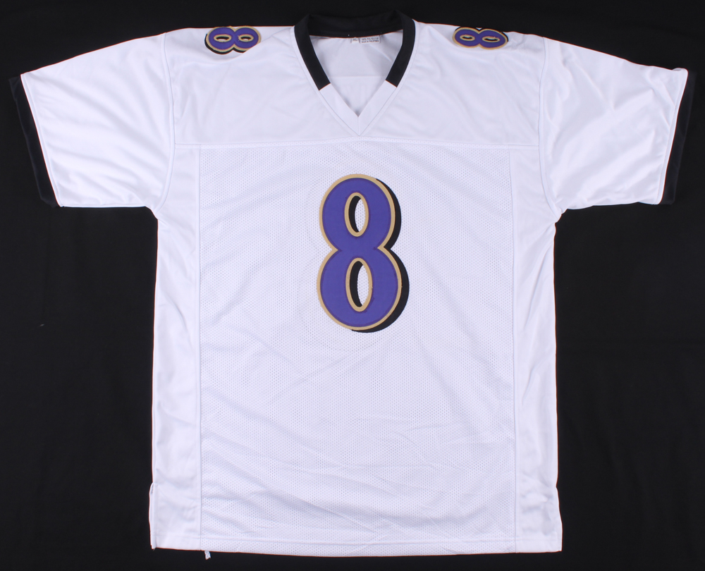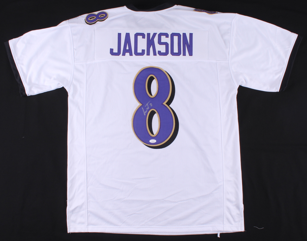 Custom on-field style jersey. Everything is sewn on, size XL. Hand-signed in silver paint pen by Lamar Jackson.
