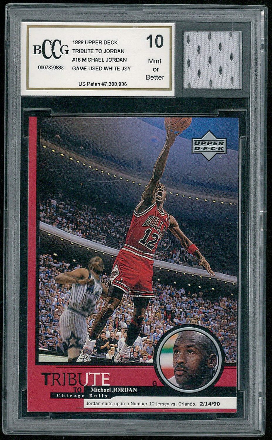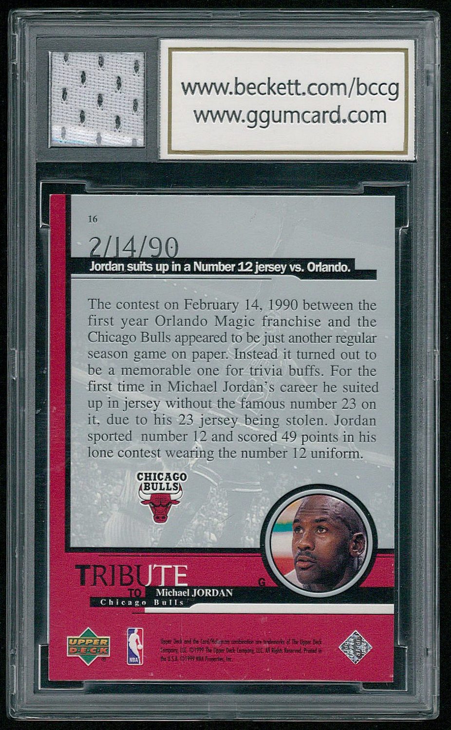 1999 Upper Deck Tribute to Michael Jordan #16 Michael Jordan/Number 12 Jersey vs. Orlando 2/14/90 (Bulls). Beckett (BCCG) graded 10. Please see the scans below for details on the condition of the card.