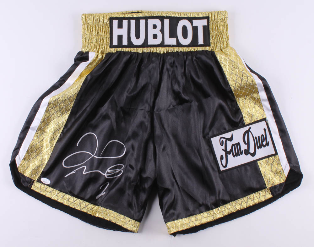Custom boxing shorts have been hand-signed in silver paint pen by Floyd Mayweather Jr.