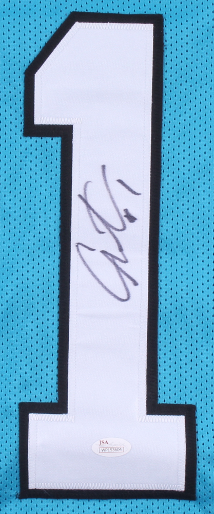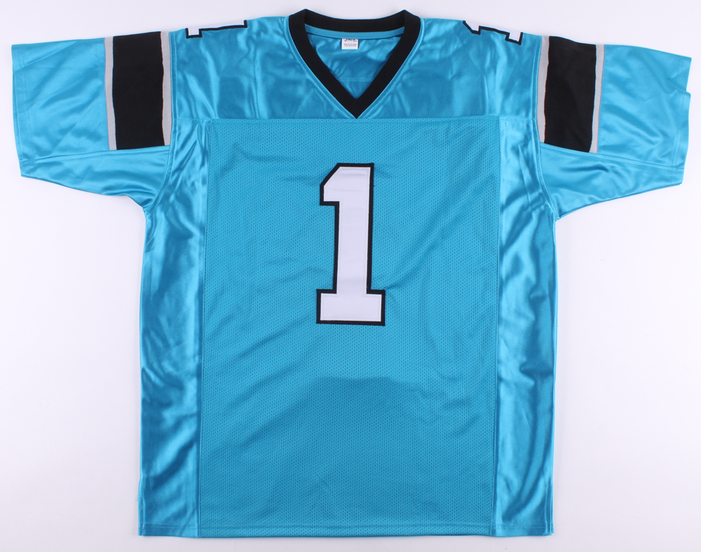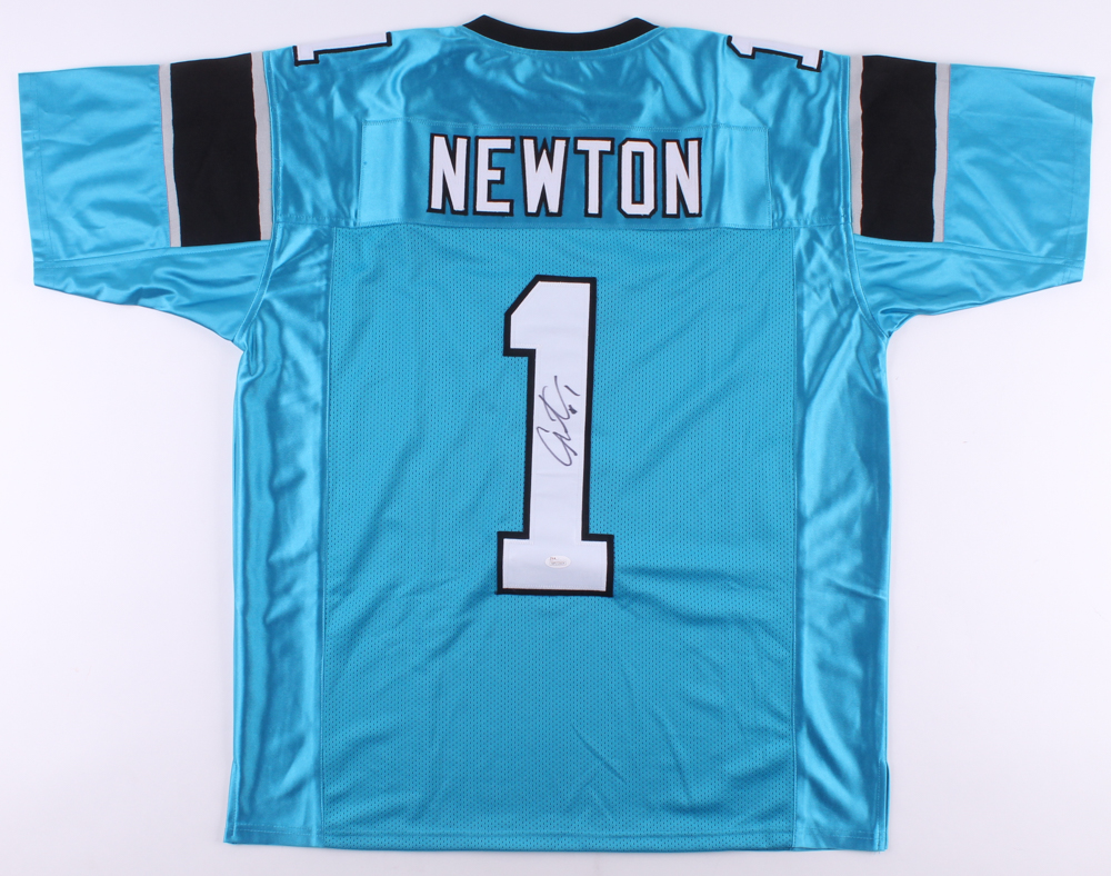 Custom on-field style jersey. Everything sewn on, size XL. Hand-signed in black felt-tip pen by Cam Newton.