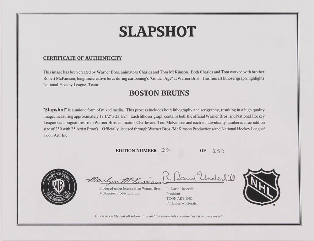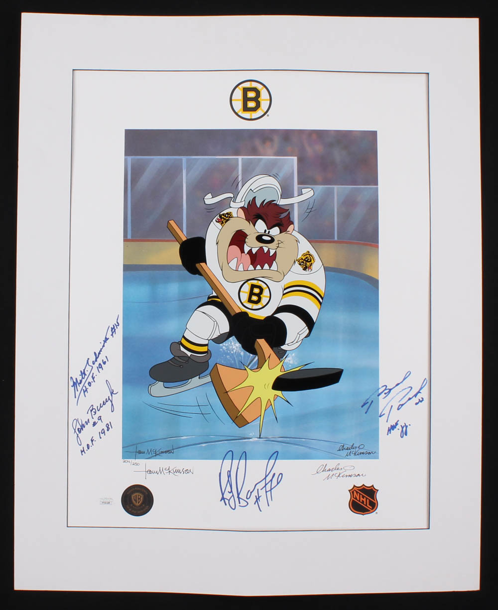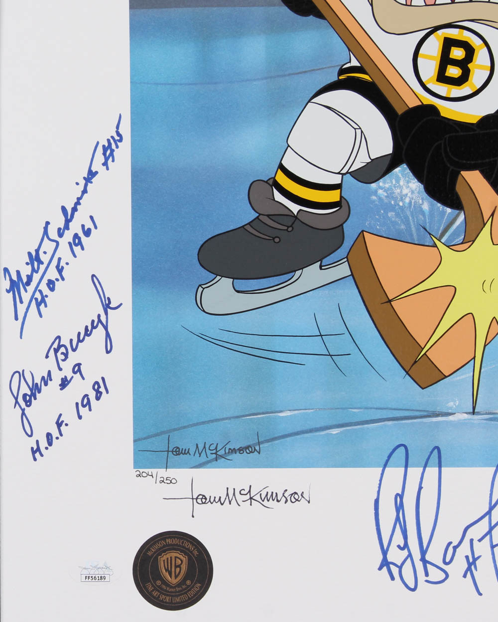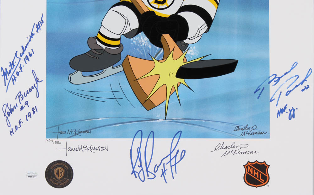 Custom matted lithoserigraph measures approximately 22” x 27.25” in size and has been hand-signed in blue felt-tip pen by John Bucyk (HOF), Milt Schmidt (D. 2017, HOF), Ray Bourque, and Brad Park (HOF). Also, includes signatures by the original artist, Charles McKimson and Tom McKimson. The lithoserigraph is a limited edition and has been hand-numbered 205/250.