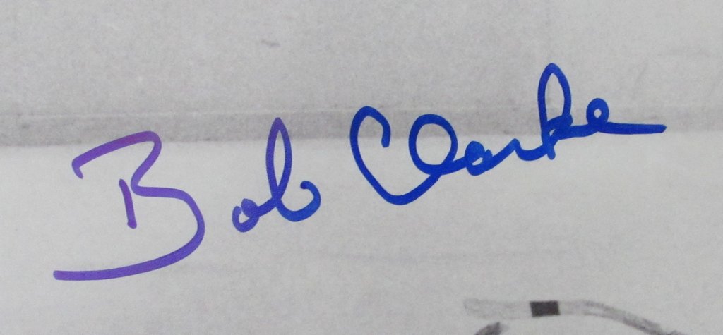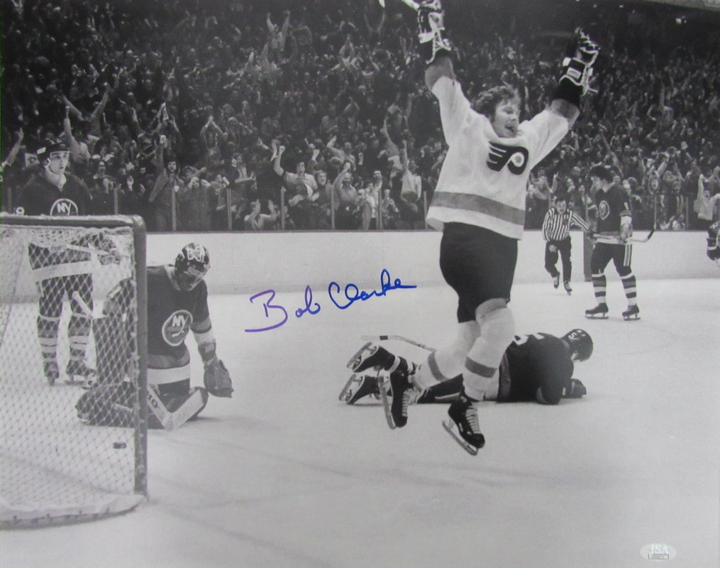 Photo measures 16" x 20" in size and has been hand-signed in blue felt-tip pen by Bob Clarke (Philadelphia Flyers, HOF).
