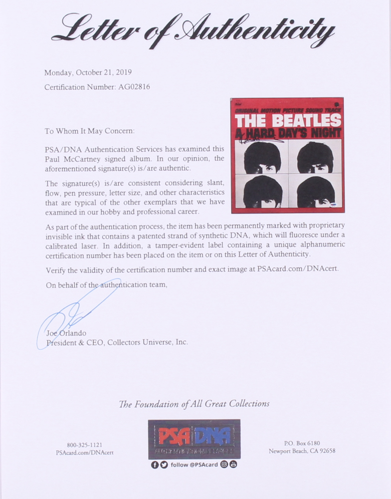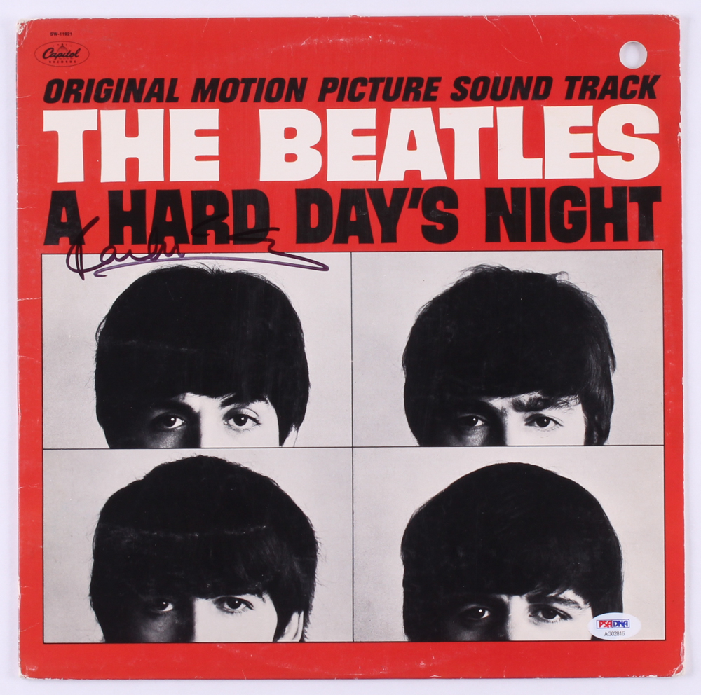 The Beatles "A Hard Day's Night" vinyl record album has been hand-signed in black felt-tip pen by Paul McCartney. The vinyl record is not included.