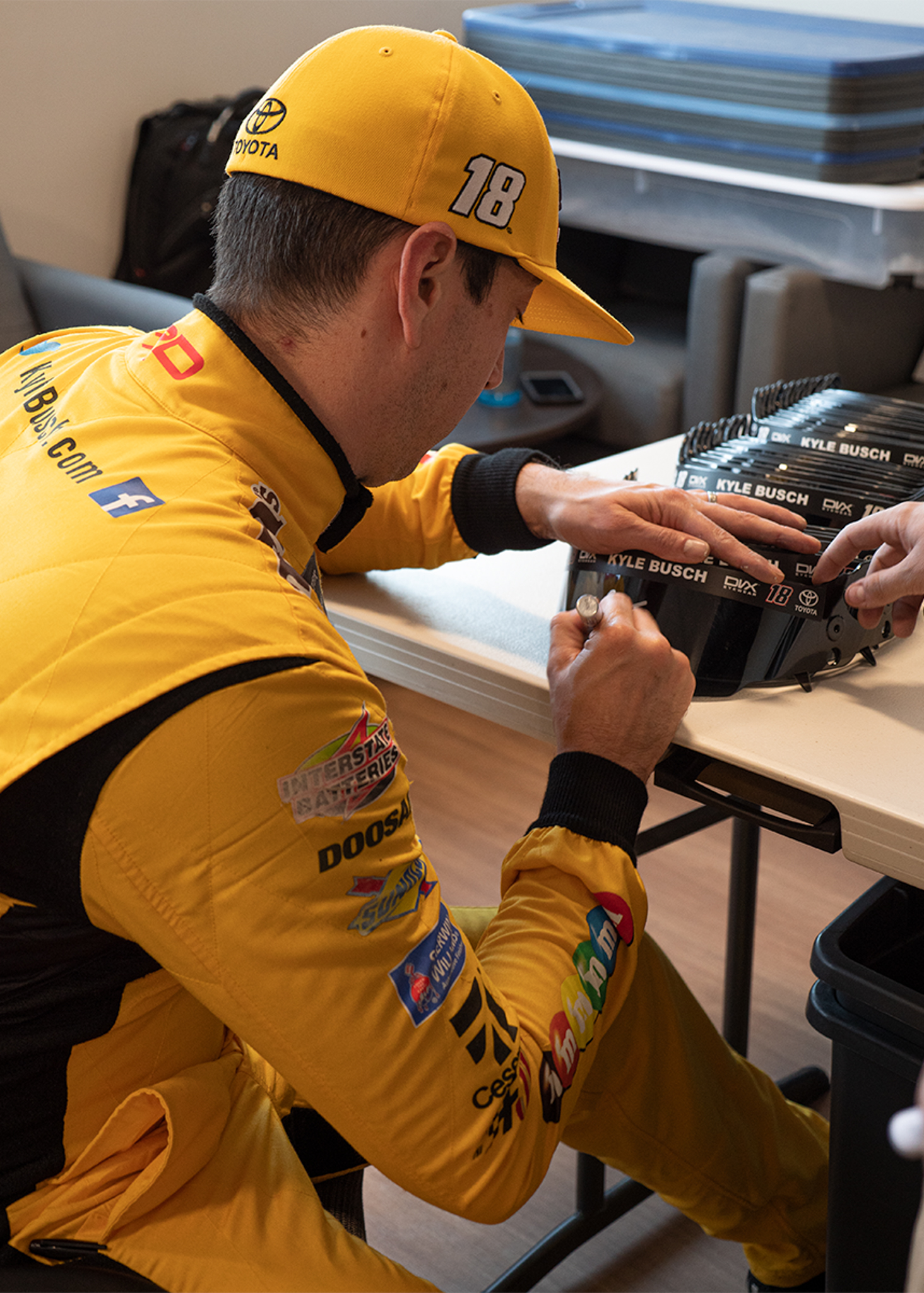 Full-size replica NASCAR helmet. The helmet has been hand-signed on the visor in silver paint pen by Kyle Busch.