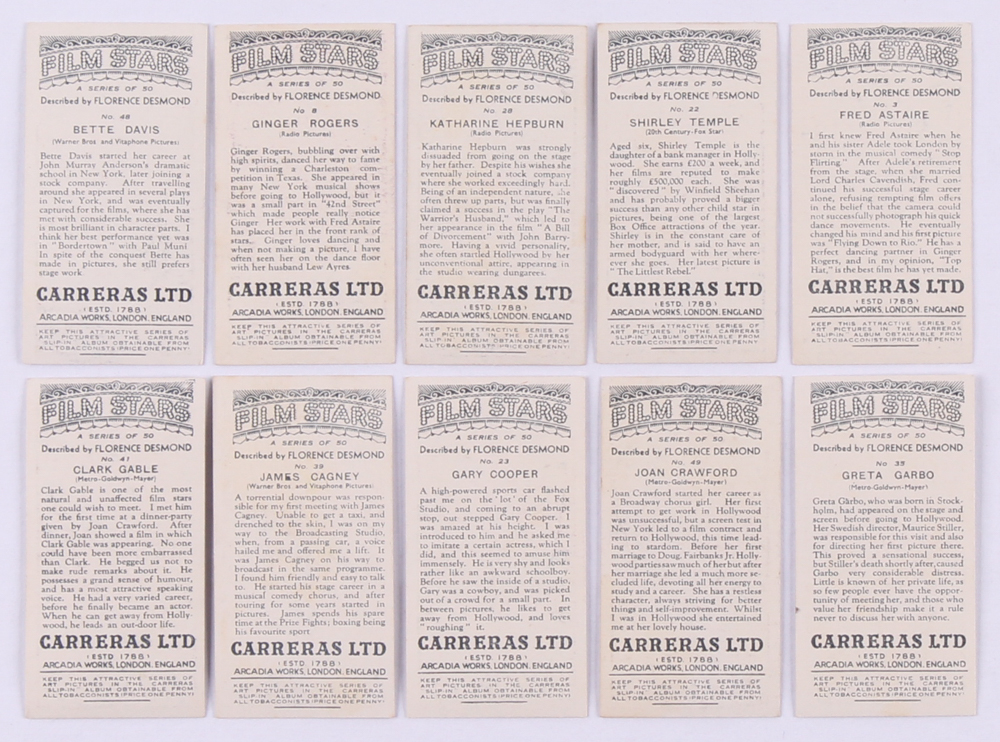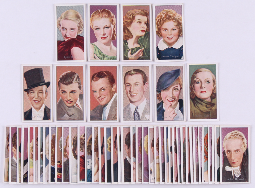 1936 Carrera's "Film Stars" Complete Set of (50) Cards with Shirley Temple, Bette Davis, Clark Gable, Katharine Hepburn