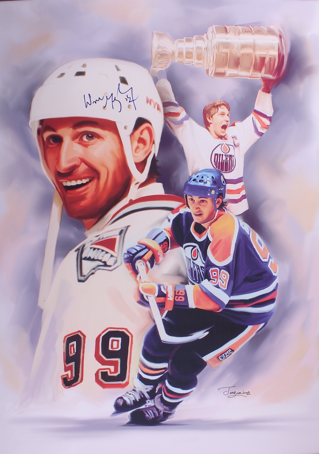 Canvas measures approximately 27" x 39" in size and is hand-signed in blue felt tip pen by Wayne Gretzky (Oilers, Kings, HOF). The autograph includes a James Spence Authentication (JSA) Auction House LOA for authenticity purposes.