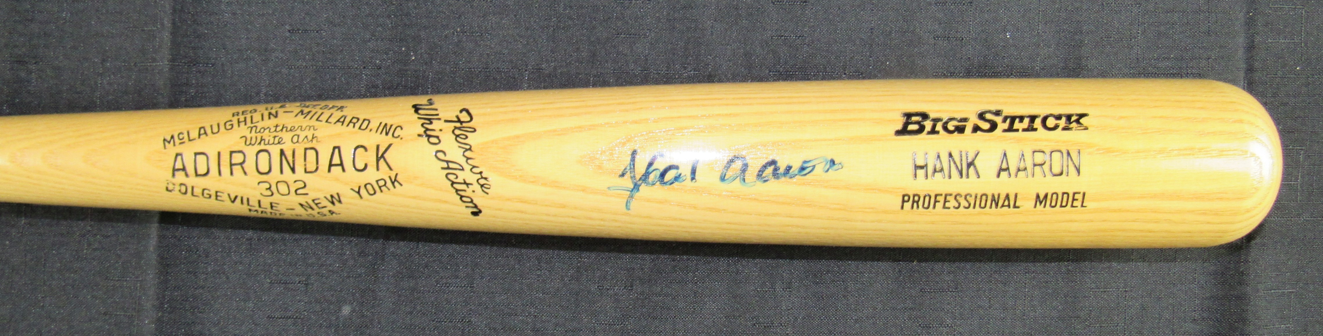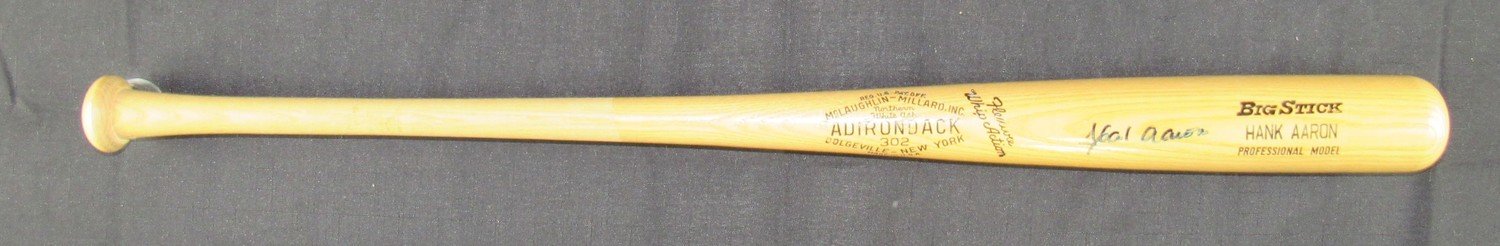McLaughlin Millard Adirondack Big Stick Whip Action Professional Model baseball bat has been hand-signed in blue felt-tip pen by Hank Aaron (Atlanta Braves, HOF). Please see photos for details.