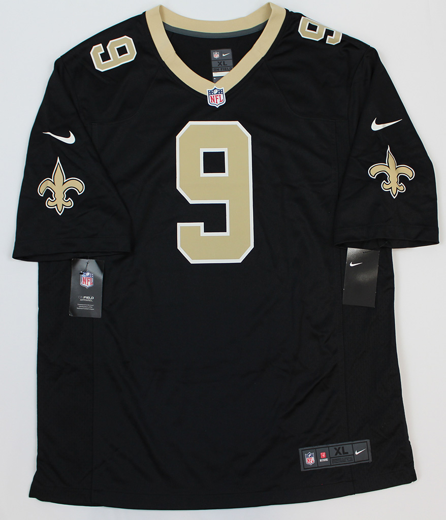 Nike on-field style jersey. Everything is printed on, size XL. Hand-signed in silver paint pen by Drew Brees.