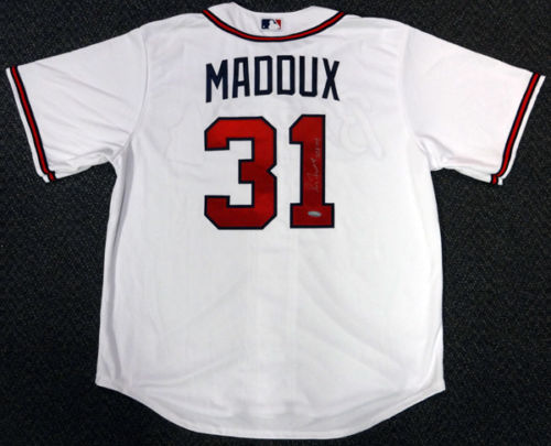 Majestic on-field style jersey. Everything is sewn on. Hand-signed and inscribed in silver paint pen by Greg Maddux (HOF).