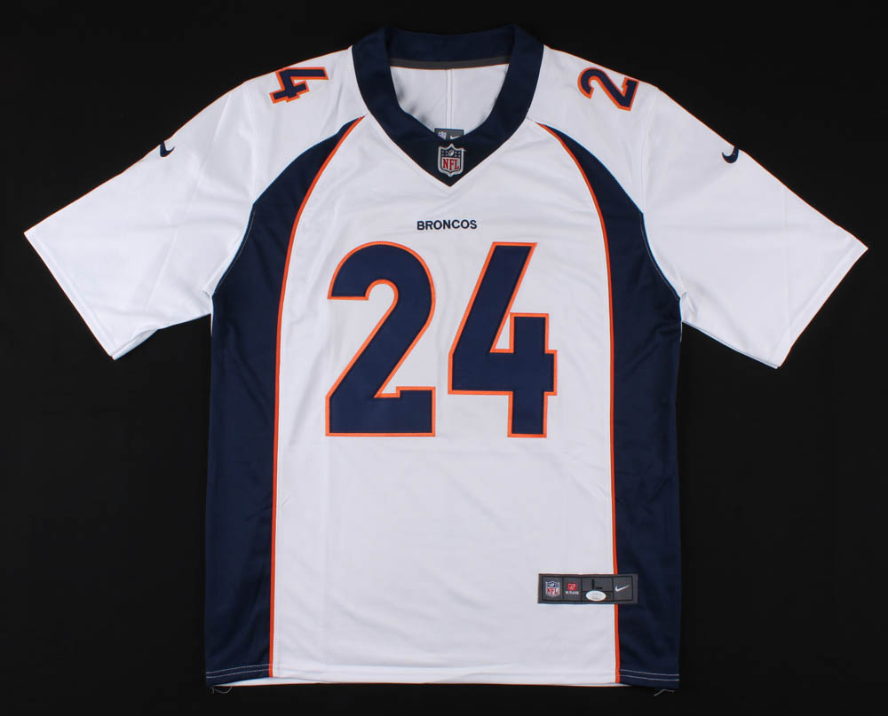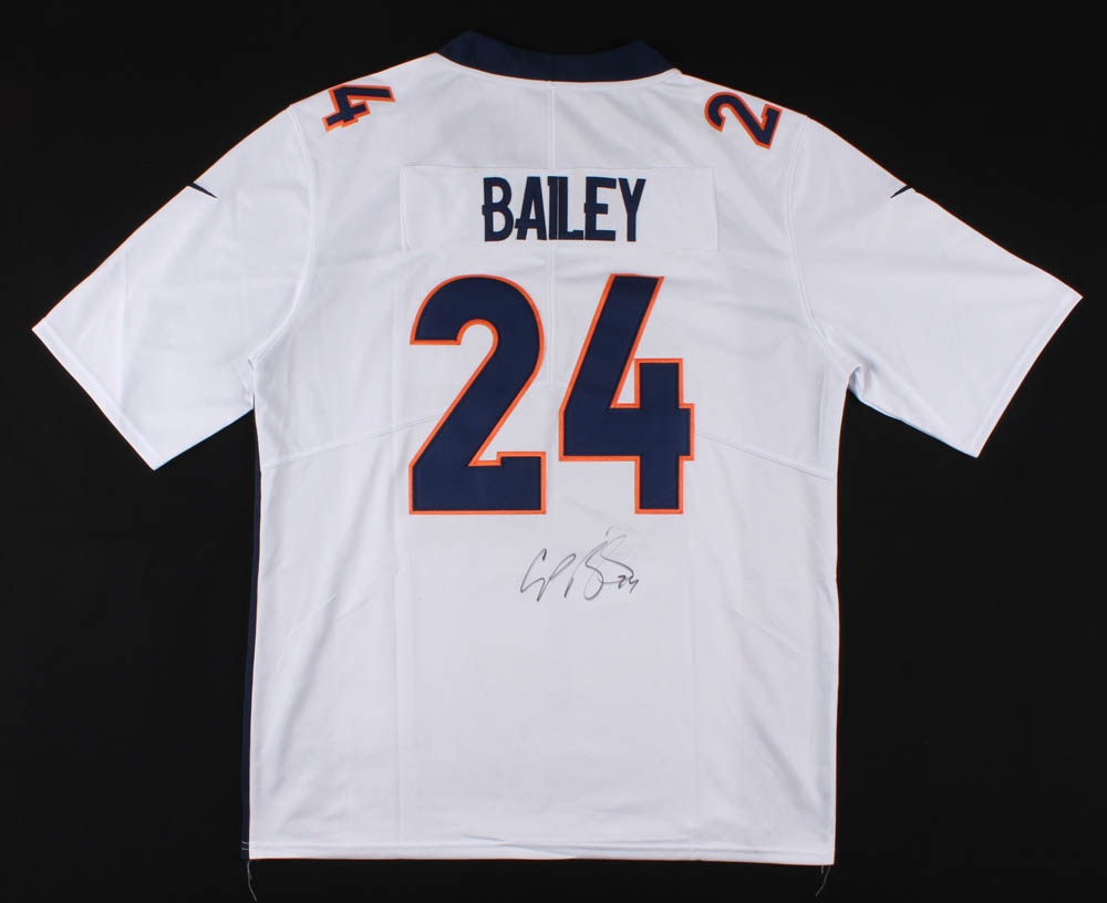 Nike on-field style jersey. Everything sewn on, size L. Hand-signed in black felt tip pen by Champ Bailey (HOF).