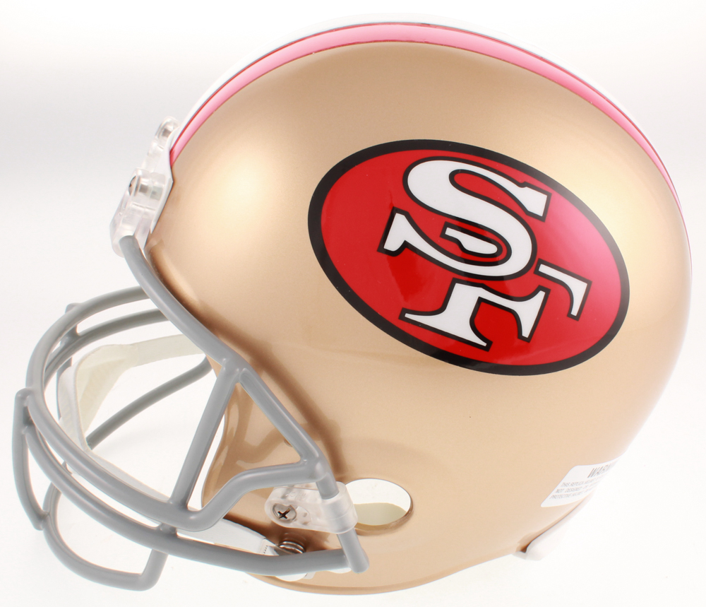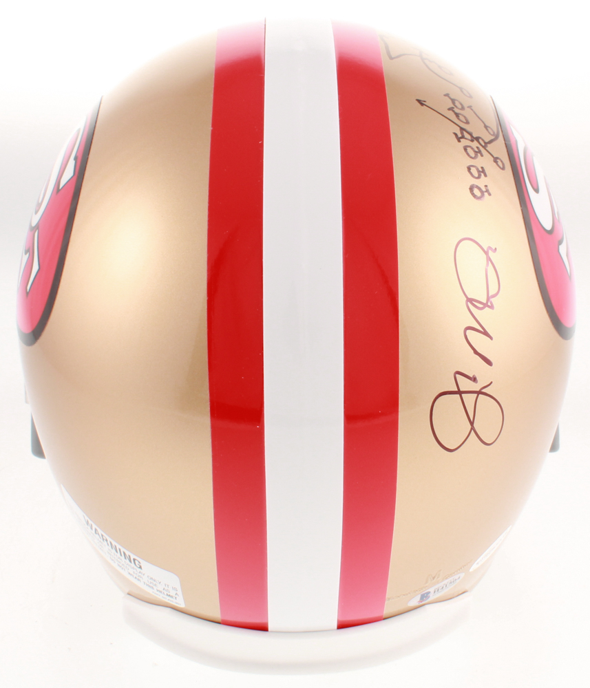Riddell San Francisco 49ers full-size replica helmet. Hand-signed in black felt-tip pen by Joe Montana (HOF) and Dwight Clark (D. 2018).