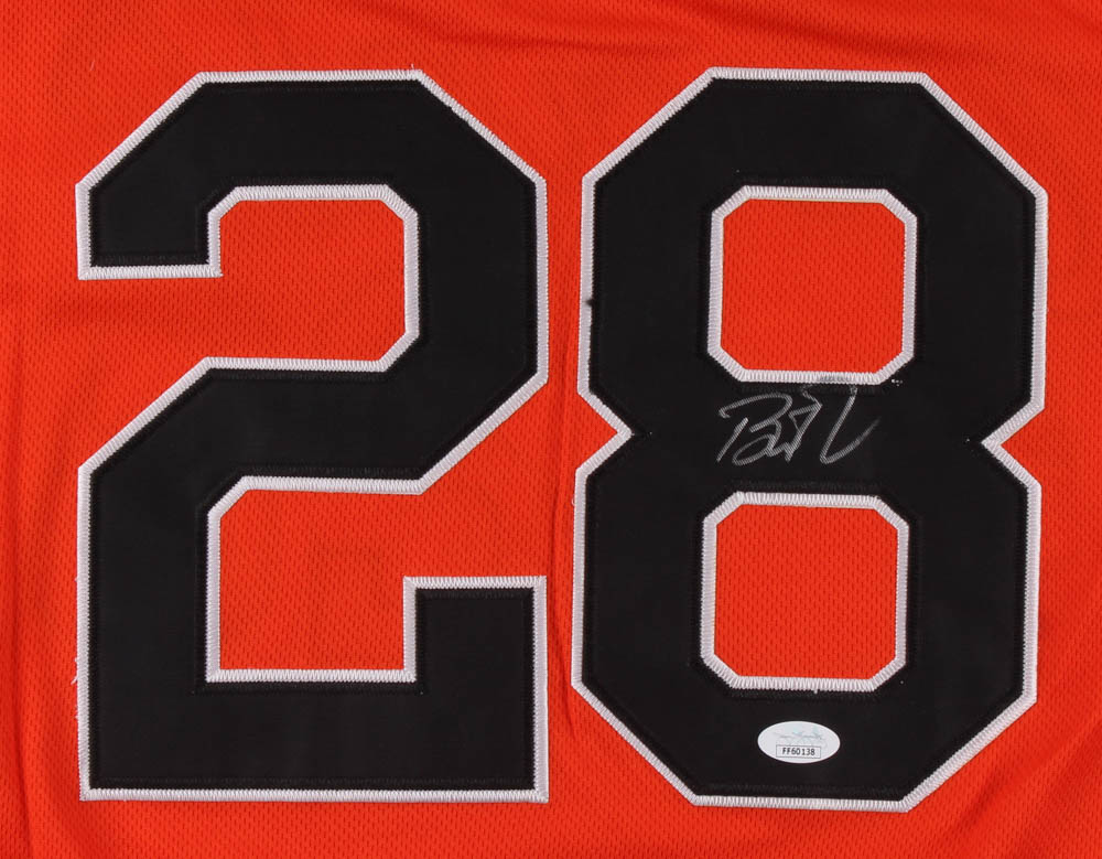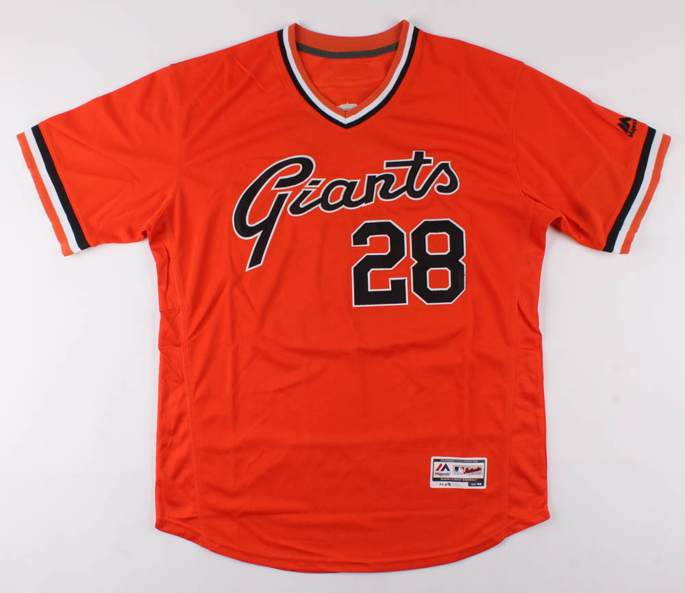Majestic on-field style jersey. Everything is sewn on, size 44. Hand-signed in silver paint pen by Buster Posey.