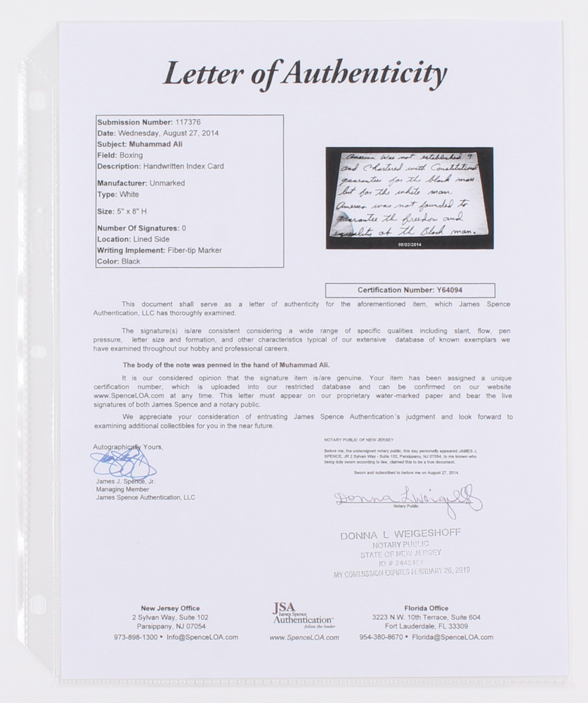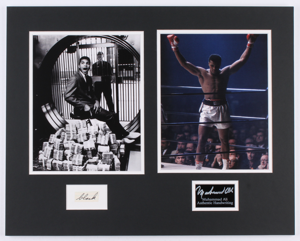 Custom matte display measures approximately 16" x 20" in size and features a cut from an index card that has been penned by the hand of Muhammad Ali (D. 2016, HOF) in black felt-tip pen. Please see photo for details regarding the condition of this matted display.