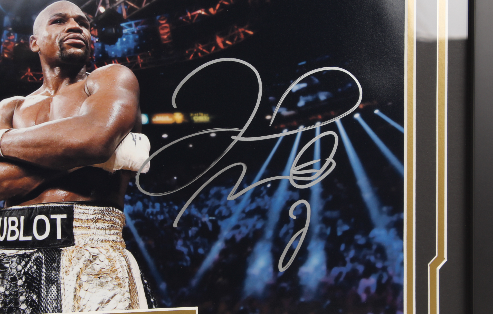 Custom framed photo display measures approximately 22" x 26" in size and has been hand-signed in silver paint pen by Floyd Mayweather Jr.