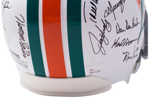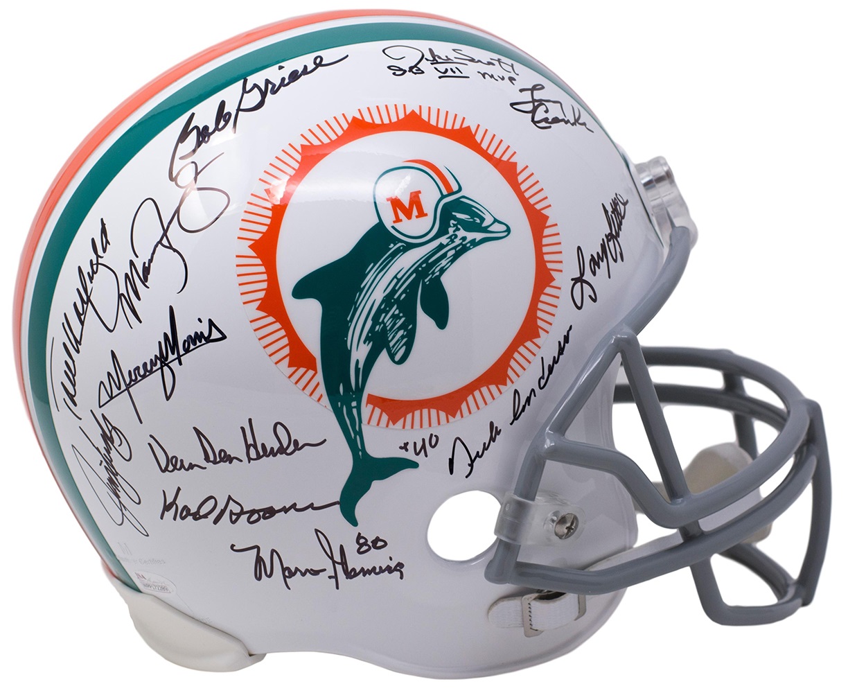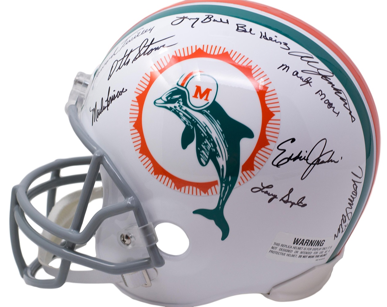 Miami Dolphins full-size replica helmet has been hand-signed in black felt-tip pen by (21) including Larry Csonka, Bob Griese, Mercury Morris, Jake Scott, Dick Anderson, Vern Don Herder, Paul Warfield, Jim Langer, Larry Little, Marv Fleming, Manny Fernandez, Norm Evans, Larry Seiple, Al Jenkins, Maulty Moore, Otto Stowe, Howard Twilley, Larry Ball, Bob Heinz, Ed Jenkins, and (1) other.