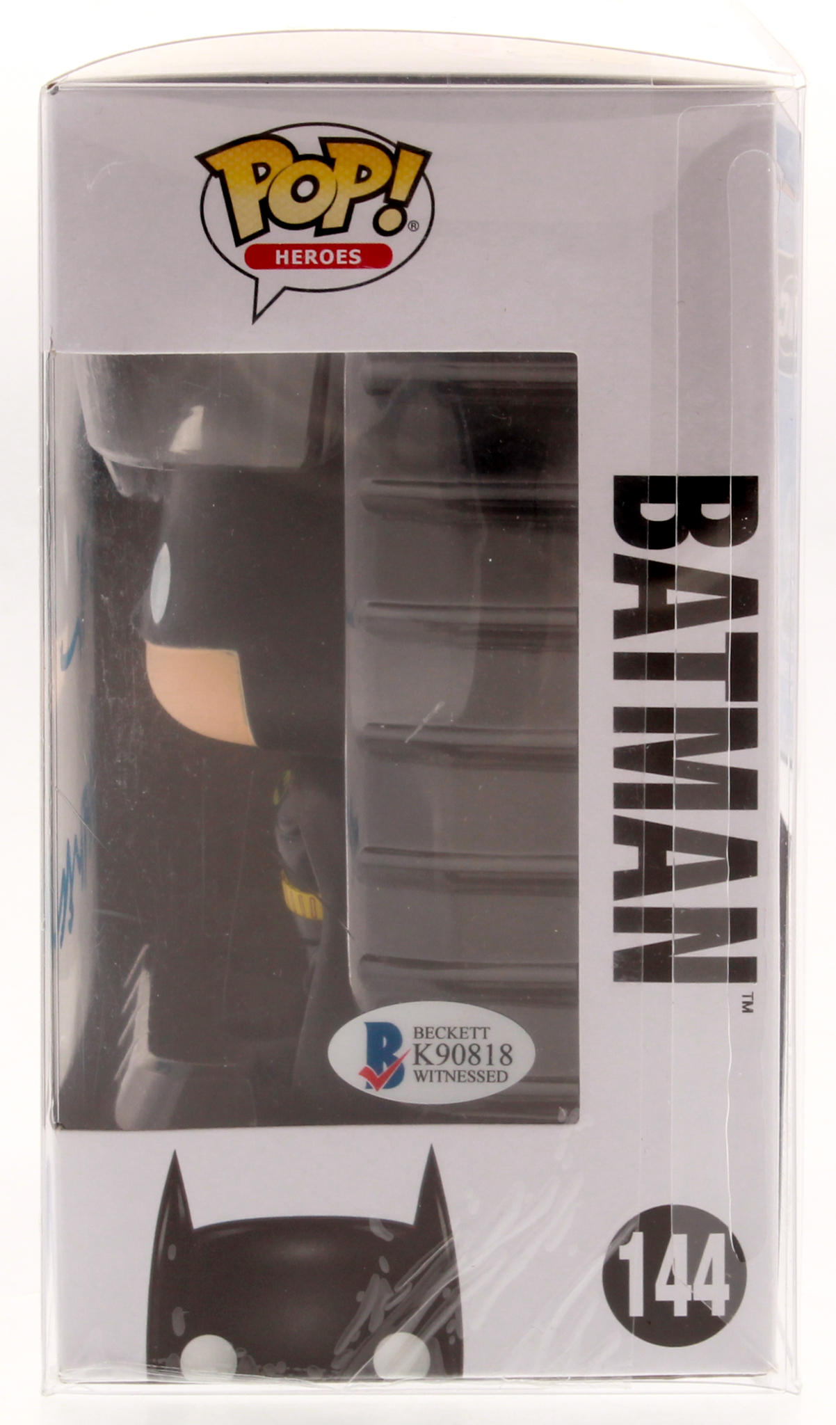 Funko Pop! vinyl figure measures approximately 4" in height. Hand-signed and inscribed on the packaging in blue paint pen by Val Kilmer (Bruce Wayne / Batman).