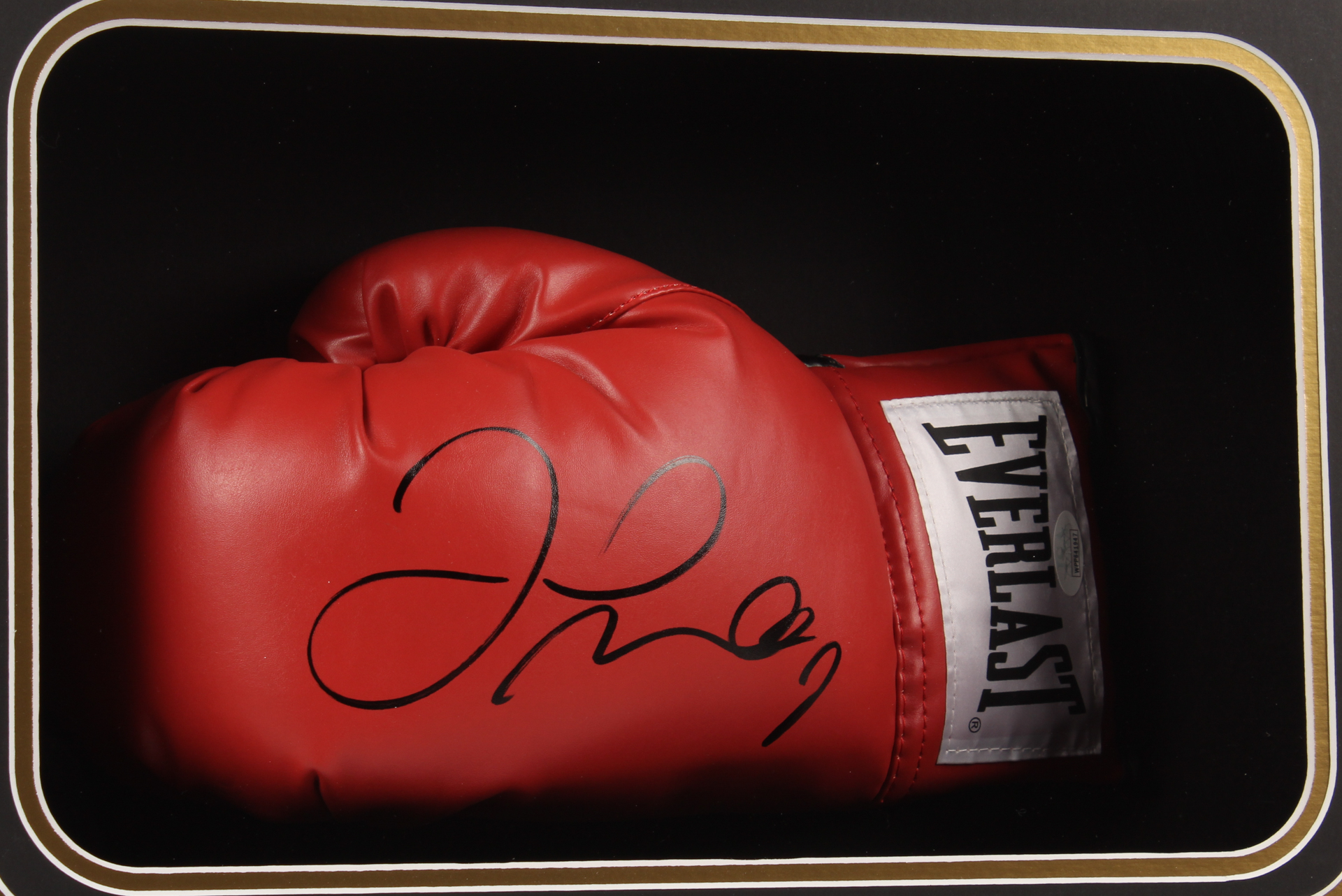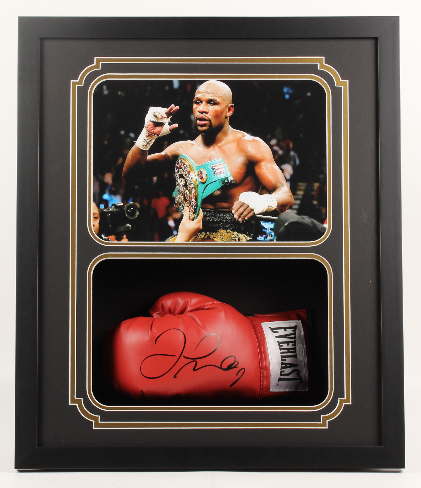 Custom framed shadow box display measures approximately 22" x 26" x4" in size and features an Everlast boxing glove that has been hand-signed in black felt-tip pen by Floyd Mayweather Jr.