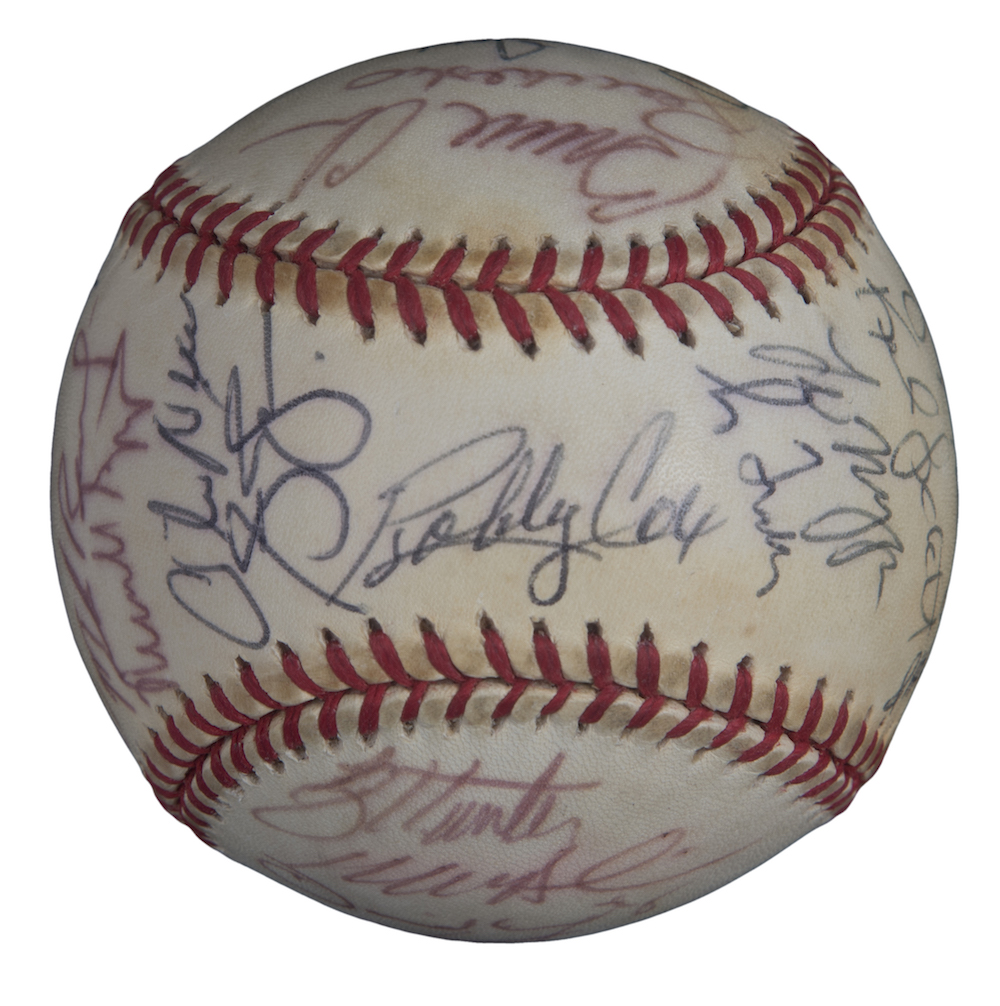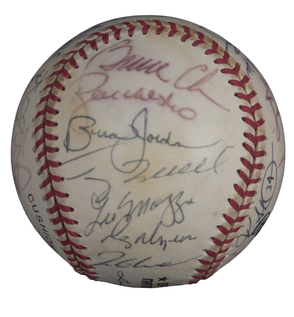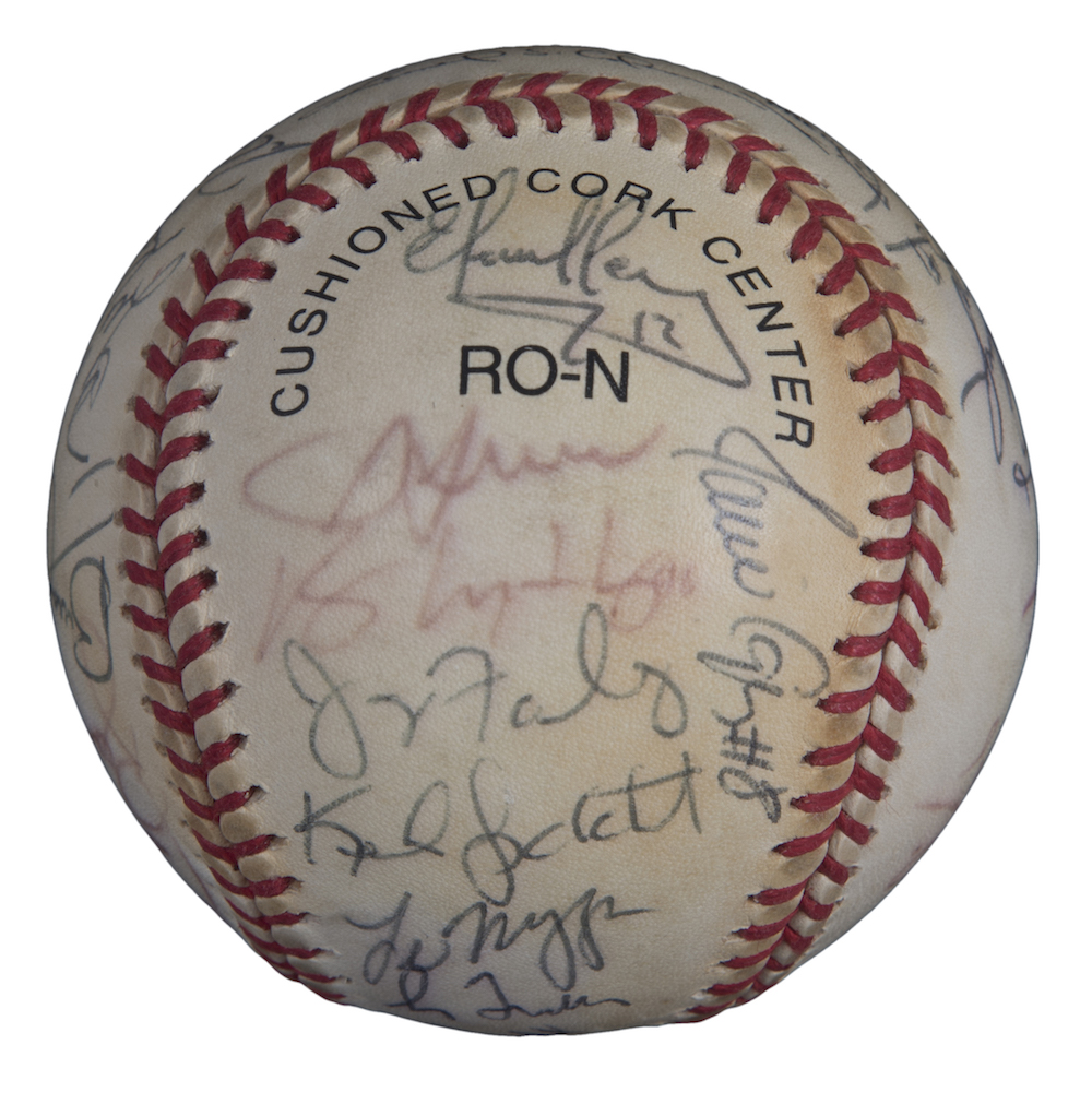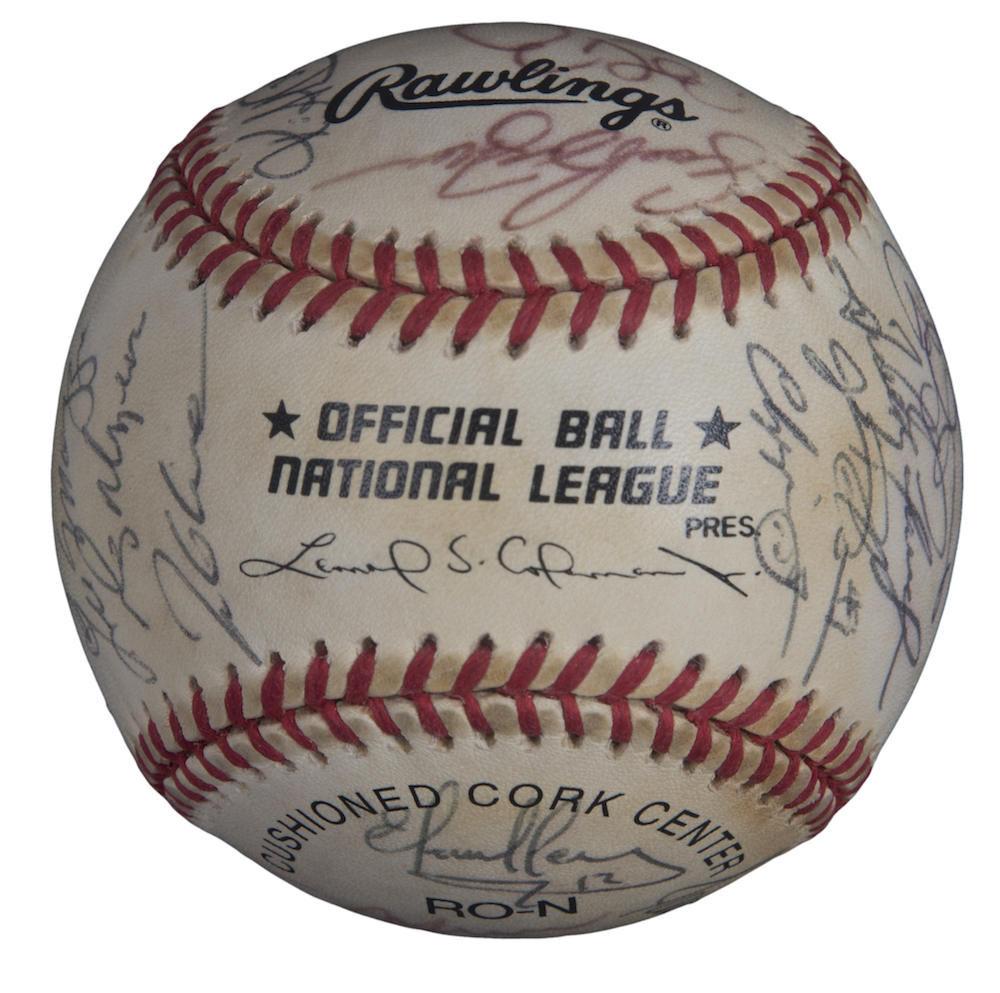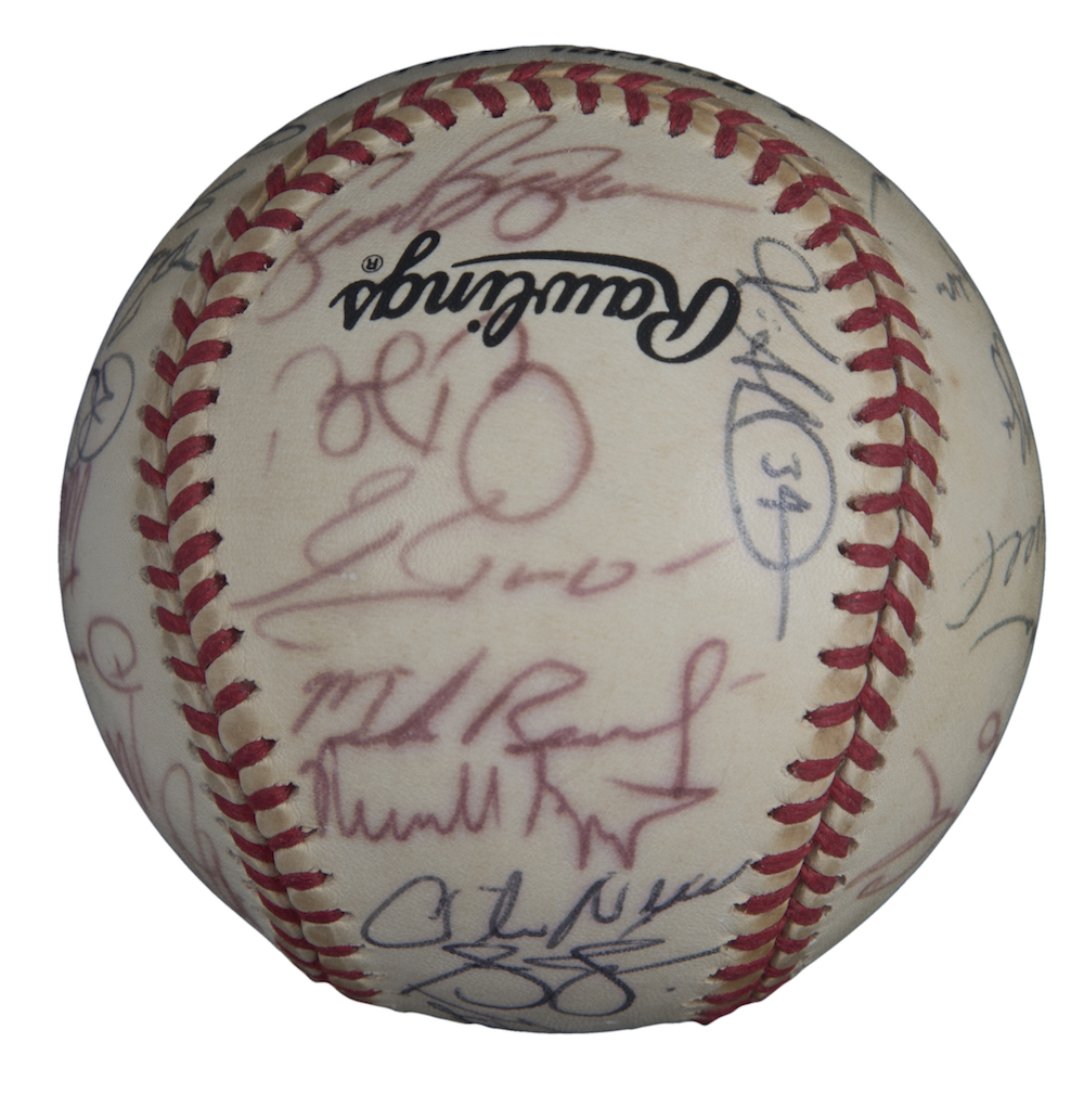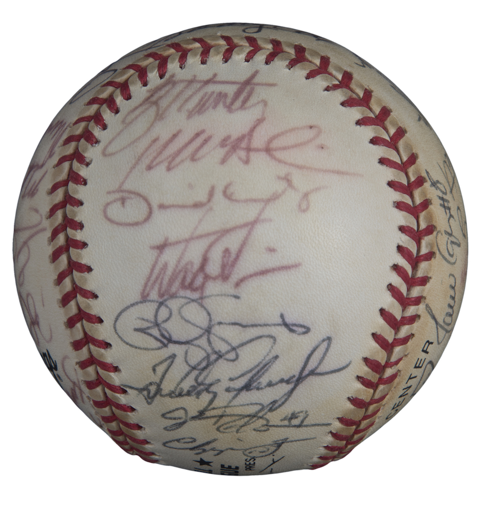 Rawlings 1999 National League Champions Atlanta Braves Offical National League Baseball team-signed in black ink pen and red ink pen by (32) including Bobby Cox, Greg Maddux, Tom Glavine, Chipper Jones, Kevin Millwood, Andruw Jones, Javy Lopez, Brian Jordan, Andres Galarraga, Bret Boone, Walt Weiss, Mike Remlinger, Sean Bergman, Bruce Chen, Micah Bowie, Leo Mazzone, and (16) others.