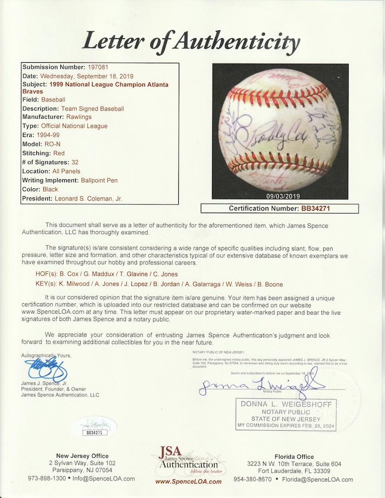 Atlanta Braves 1999 National League Champions ONL Baseball Team-Signed by (32) with Bobby Cox, Greg Maddux, Tom Glavine, Chipper Jones (JSA LOA)