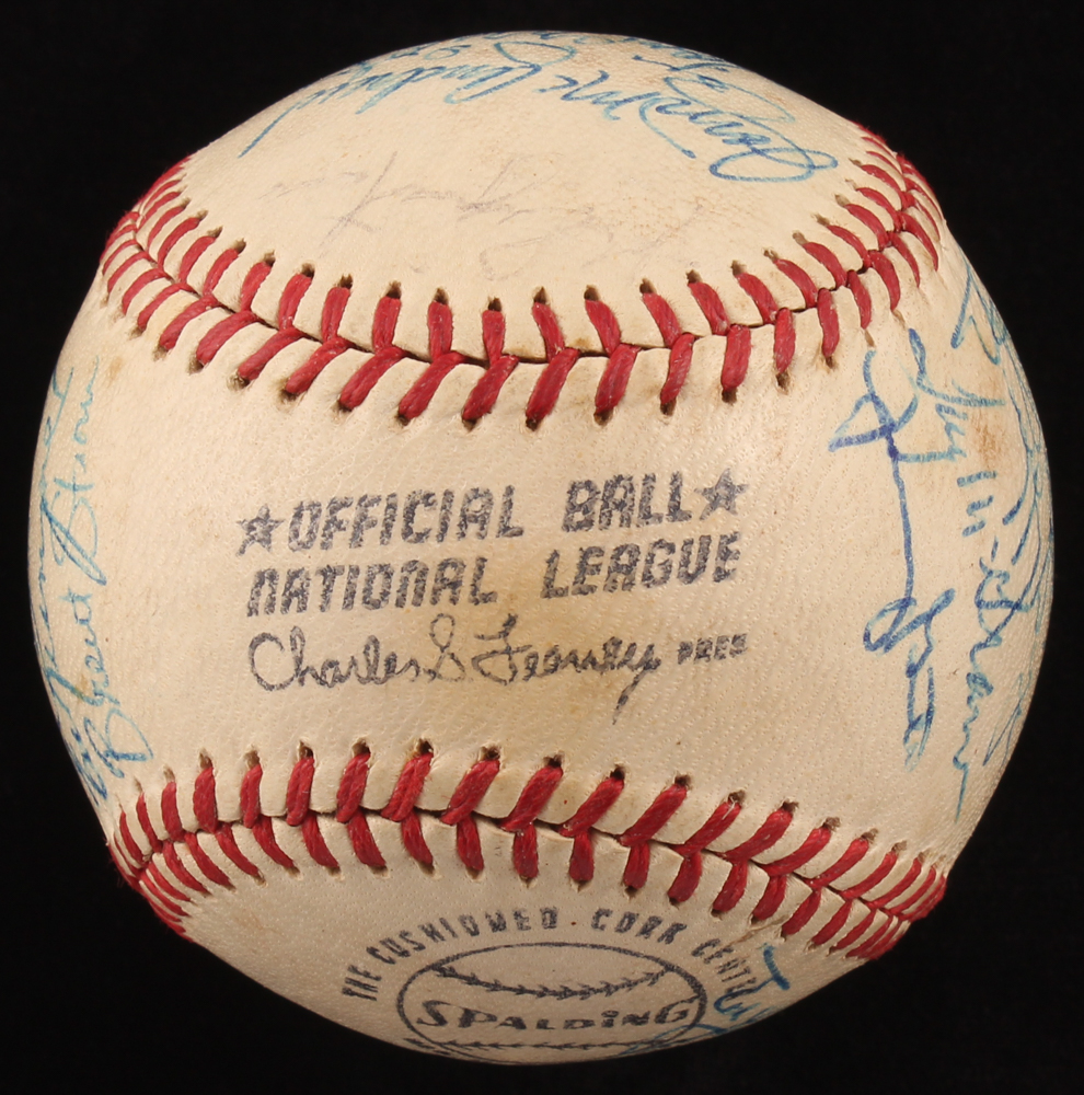 Spalding Official National League baseball has been hand-signed in blue and black ink pen by (27) including Ed Kranepool, Willie Mays, Tom Seaver, Tug McGraw, Rusty Staub, Jerry Kroosman, Yogi Berra, Lute Barnes, Duffy Dyer, Jim Beauchamp, Sheriff Robinson, John Milner, Ken Boswell, Brent Strom, Jim McAndrew, Gary Gentry, Jon Matlack and (10) others. Please see images for details regarding the condition of the baseball.