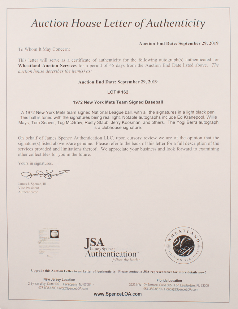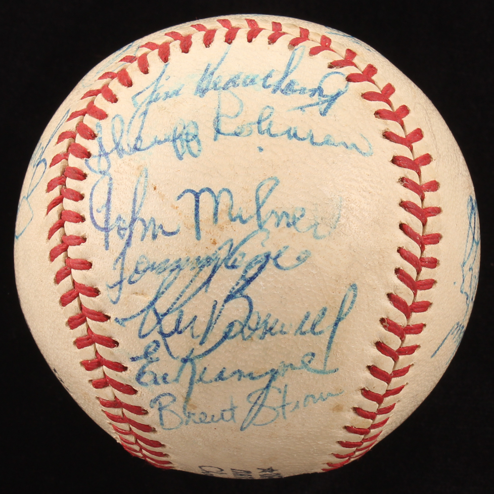 1972 New York Mets ONL Baseball Team-Signed by (27) with Ed Kranepool, Willie Mays, Tom Seaver, Tug McGraw, Rusty Staub (JSA ALOA)