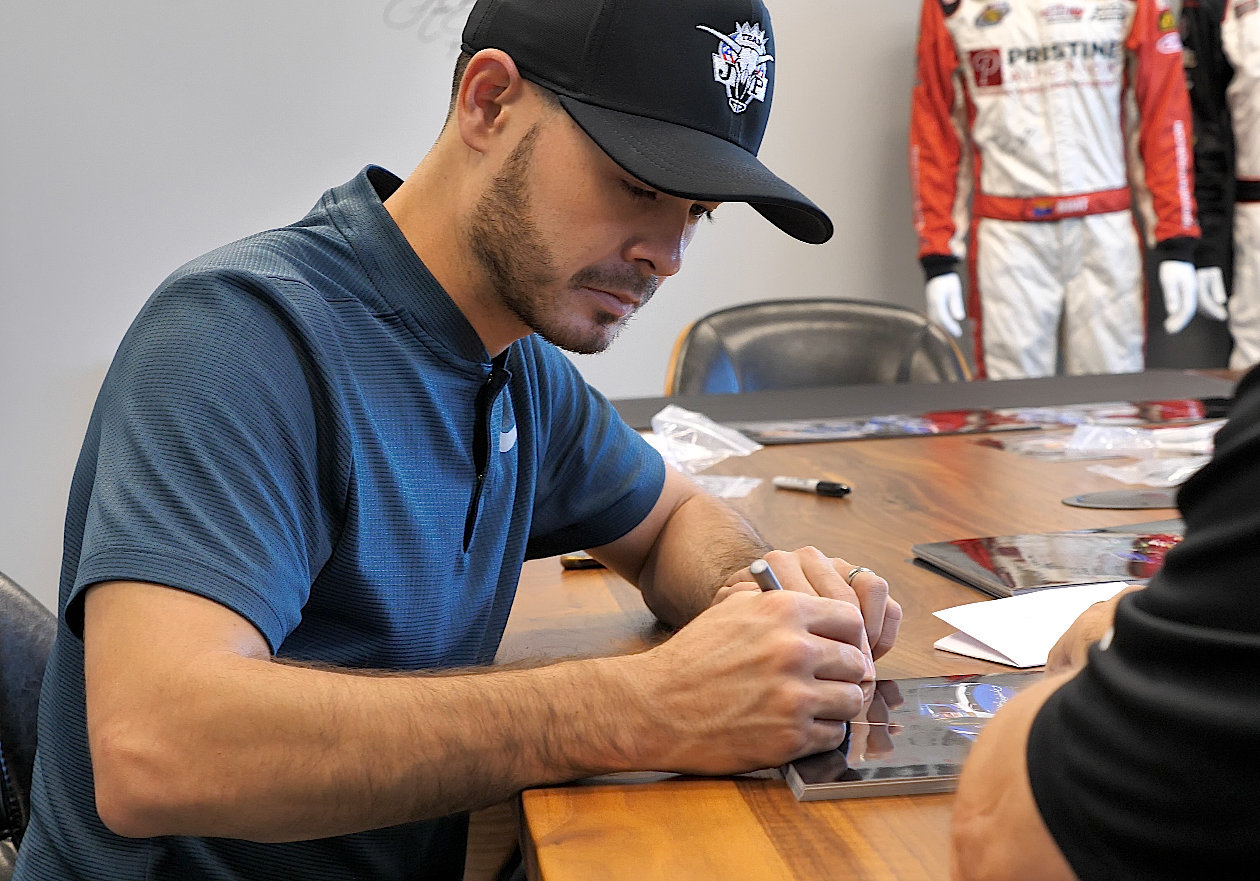 Photo measures 11" x 14" in size and is hand-signed in silver paint pen by Kyle Larson.