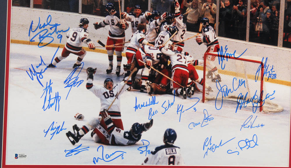Custom frame measures 27.5" x 29.5" in size and features a photo of the USA hockey team during the 1980 Winter Olympics in Lake Placid team-signed in blue felt-tip pen by (19) with Jim Craig, Mike Eruzione, Bill Baker, Dave Christain, Steve Christoff, Steve Janaszak, Rob McClanahan, Ken Morrow, Craig Patrick, Buzz Schneider, Dave Silk, Eric Strobel, Phil Verchota, Neal Broten, Mark Wells, and (4) others.