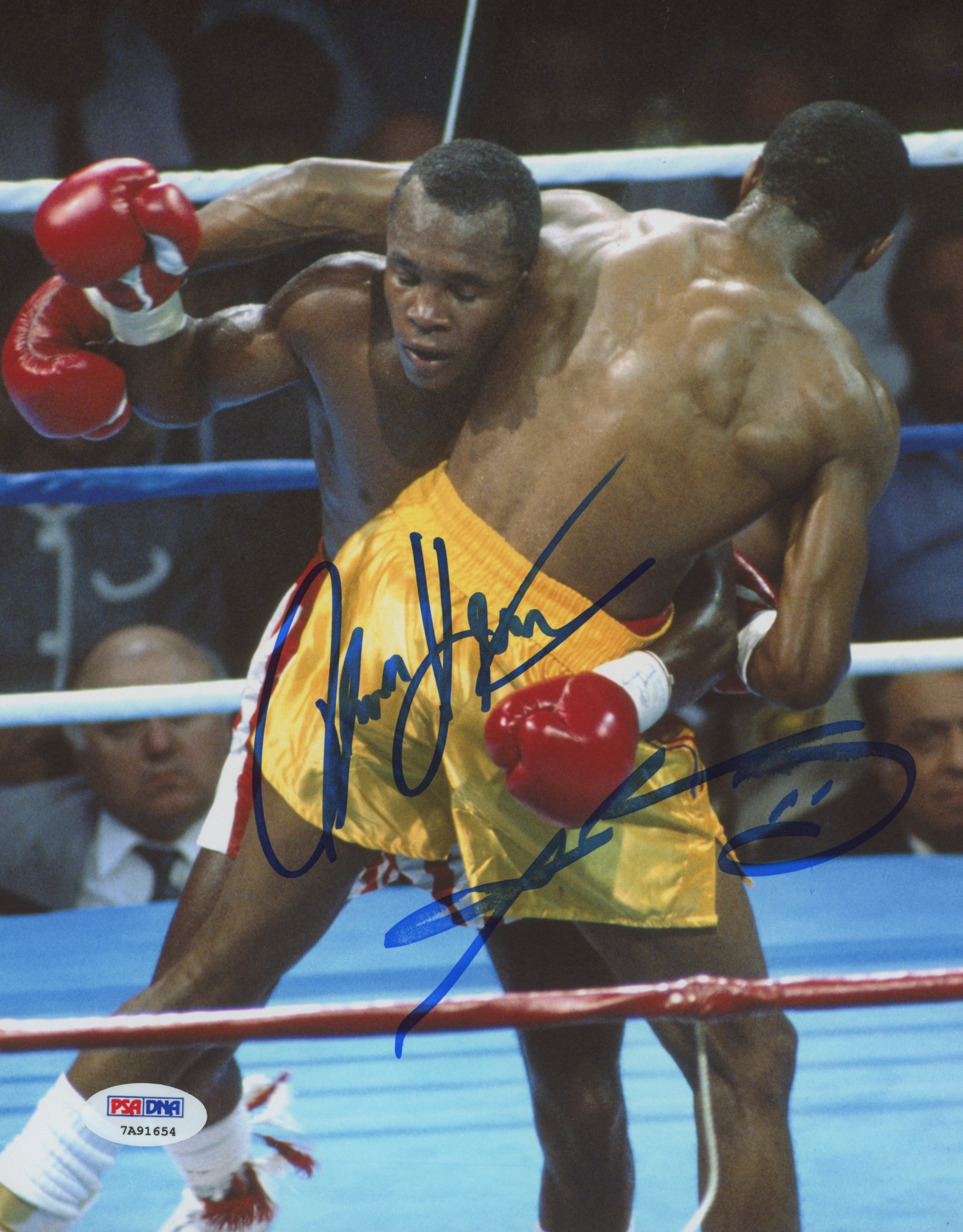 Photo measures 8" x 10" in size and has been hand-signed in blue felt tip pen by Sugar Ray Leonard (HOF) and Thomas "Hitman" Hearns (HOF).