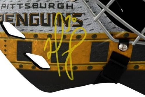 Pittsburgh Penguins full-size goalie mask. Hand-signed in yellow paint pen by Matt Murray.