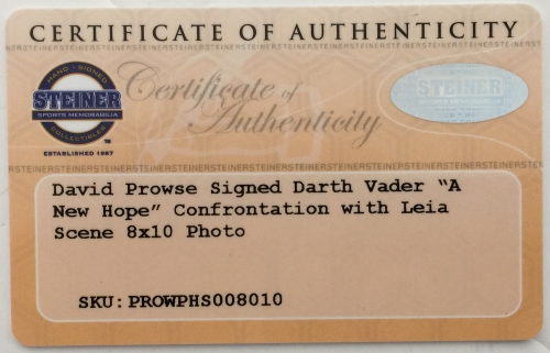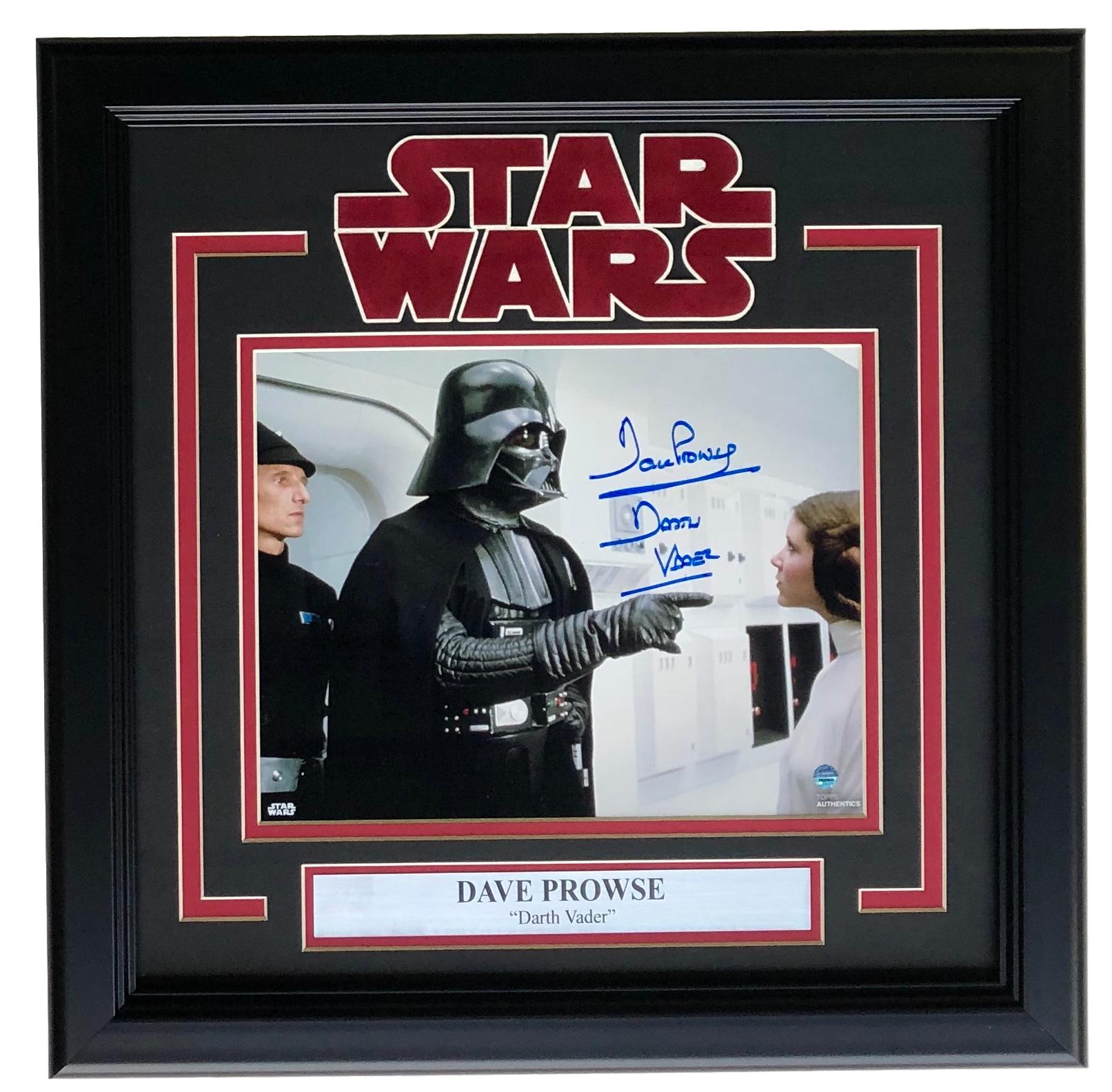 Custom framed display measures 16" x 17" in size and features a 8"x10" photo that has been hand-signed in blue felt-tip pen by Dave Prowse.