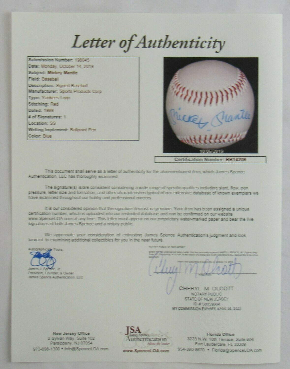 Mickey Mantle Signed New York Yankees Logo Baseball (JSA LOA)