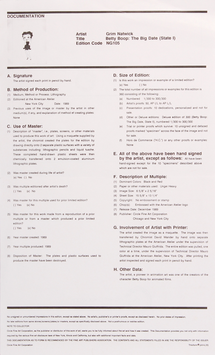 The Big Date is a rare 17.5 x 13.25" limited edition Betty Boop lithograph printed on highest quality fiber infused Ungei Heavy paper. Released in 1989 by Circle Fine Art Corp. Published retail price, $3000. The print is numbered and is hand-signed by animator Grim Natwick (D 1990). The Betty Boop limited edition lithographs, created by Grim Natwick for Circle Fine Art in 1989, were the only lithographs the artist ever made - completed at the age of 99. Myron "Grim" Natwick was born in 1890 in Wisconsin Rapids, Wisconsin, where he is still considered a favorite son &, throughout his lifetime, displayed exhibitions of his work there.