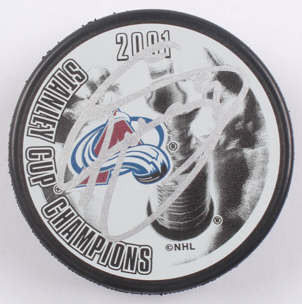2001 Colorado Avalanche Stanley Cup Champions Logo Hockey Puck. Hand-signed in silver paint pen by Joe Sakic (HOF).