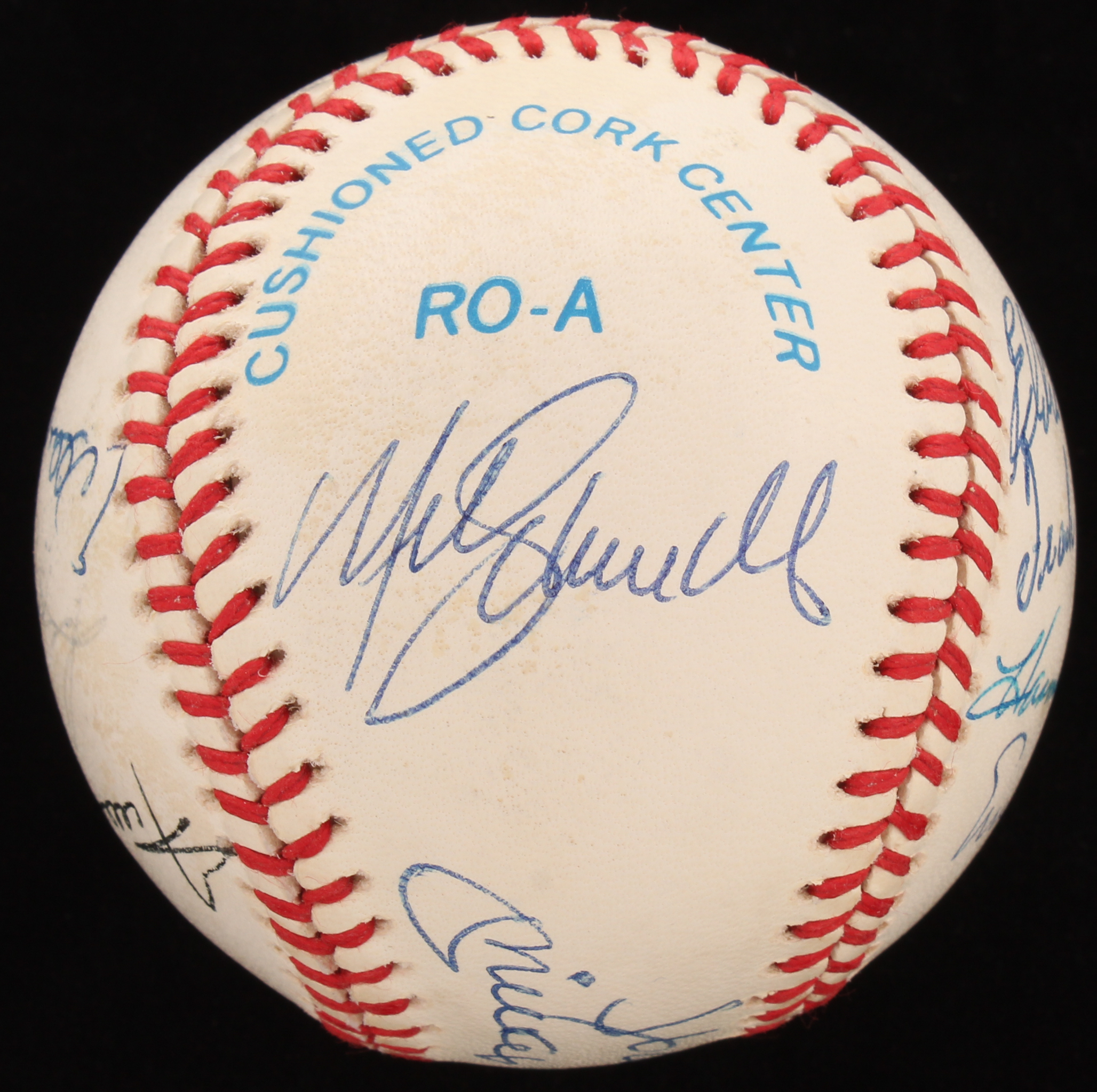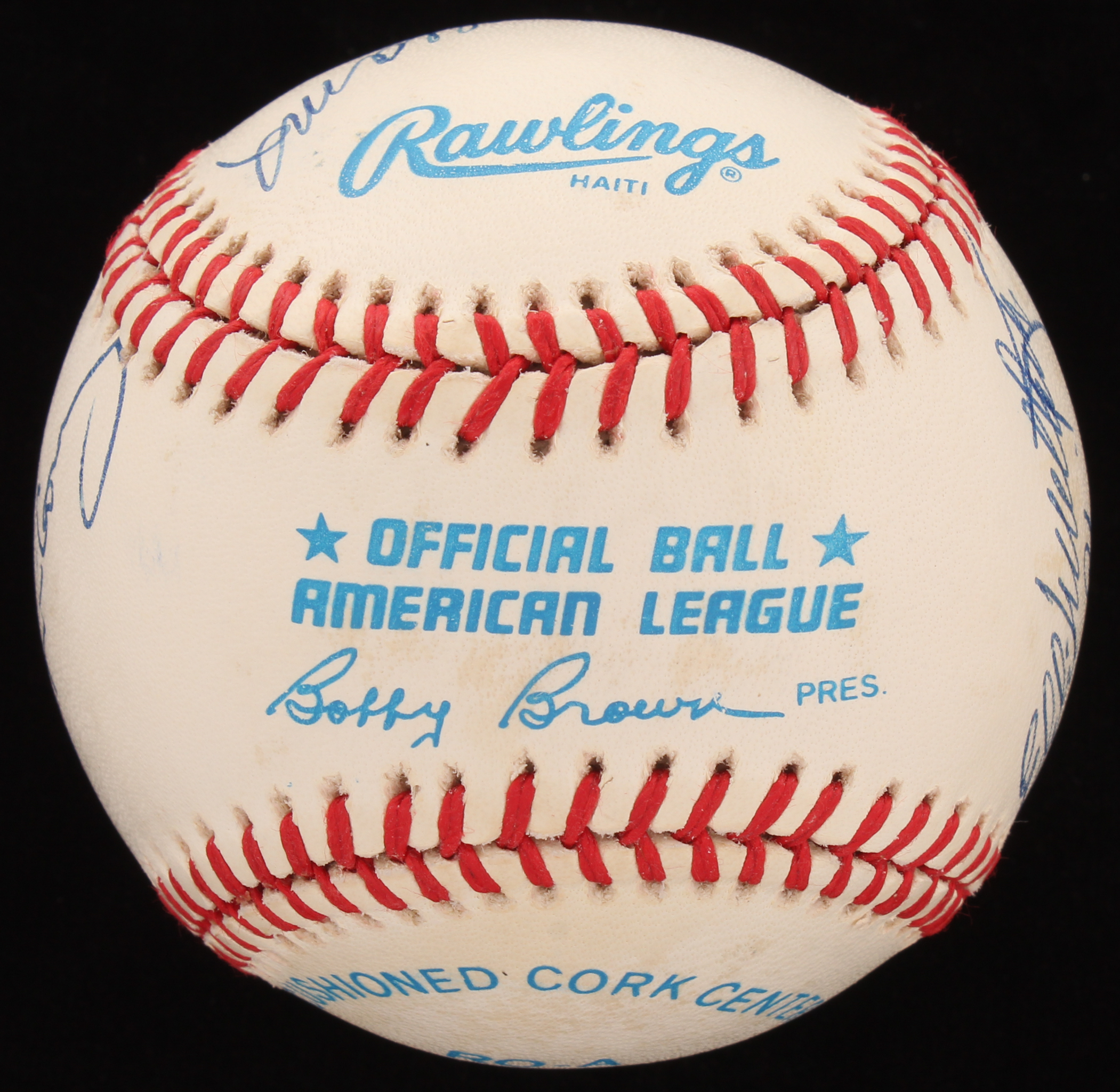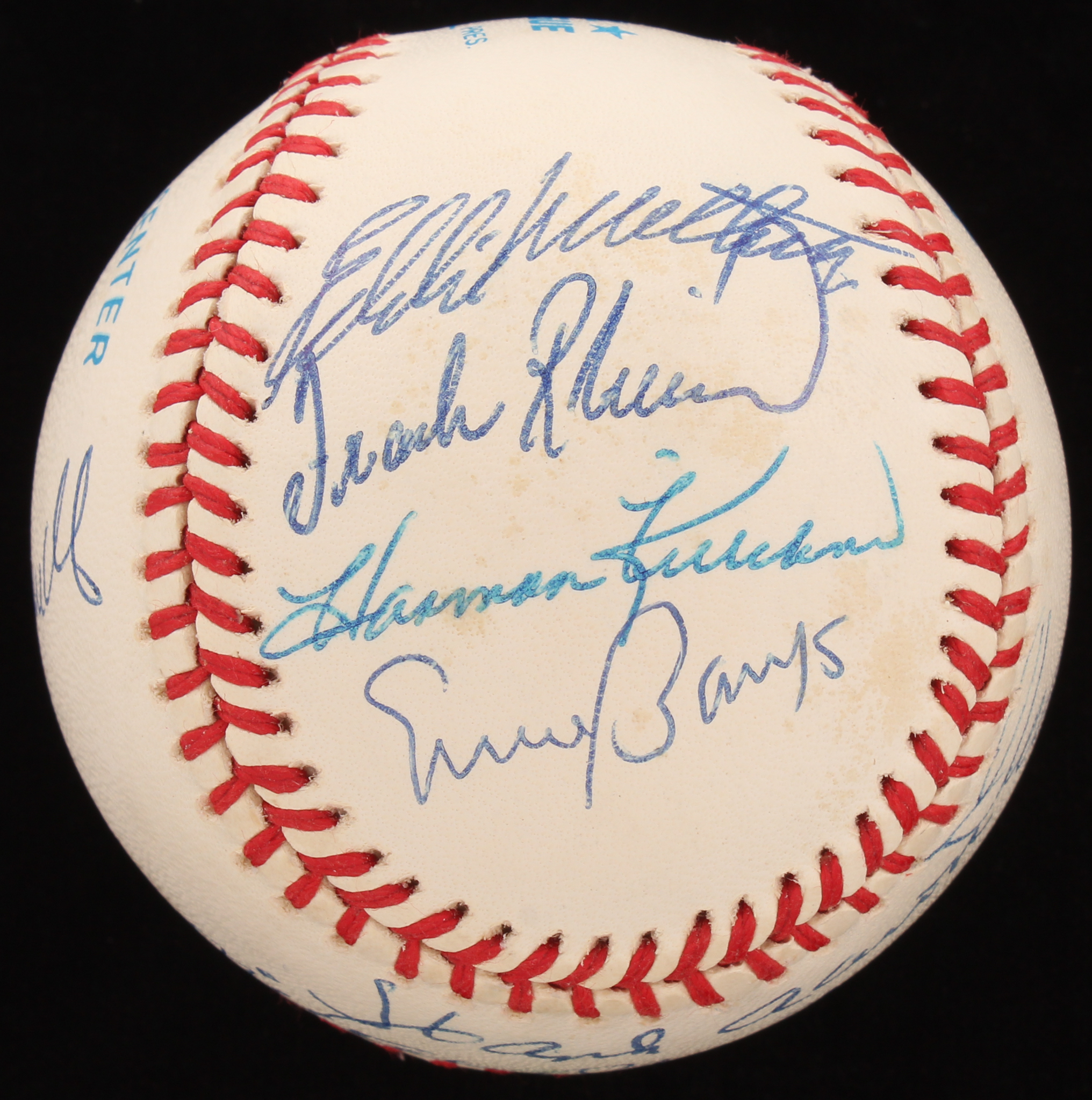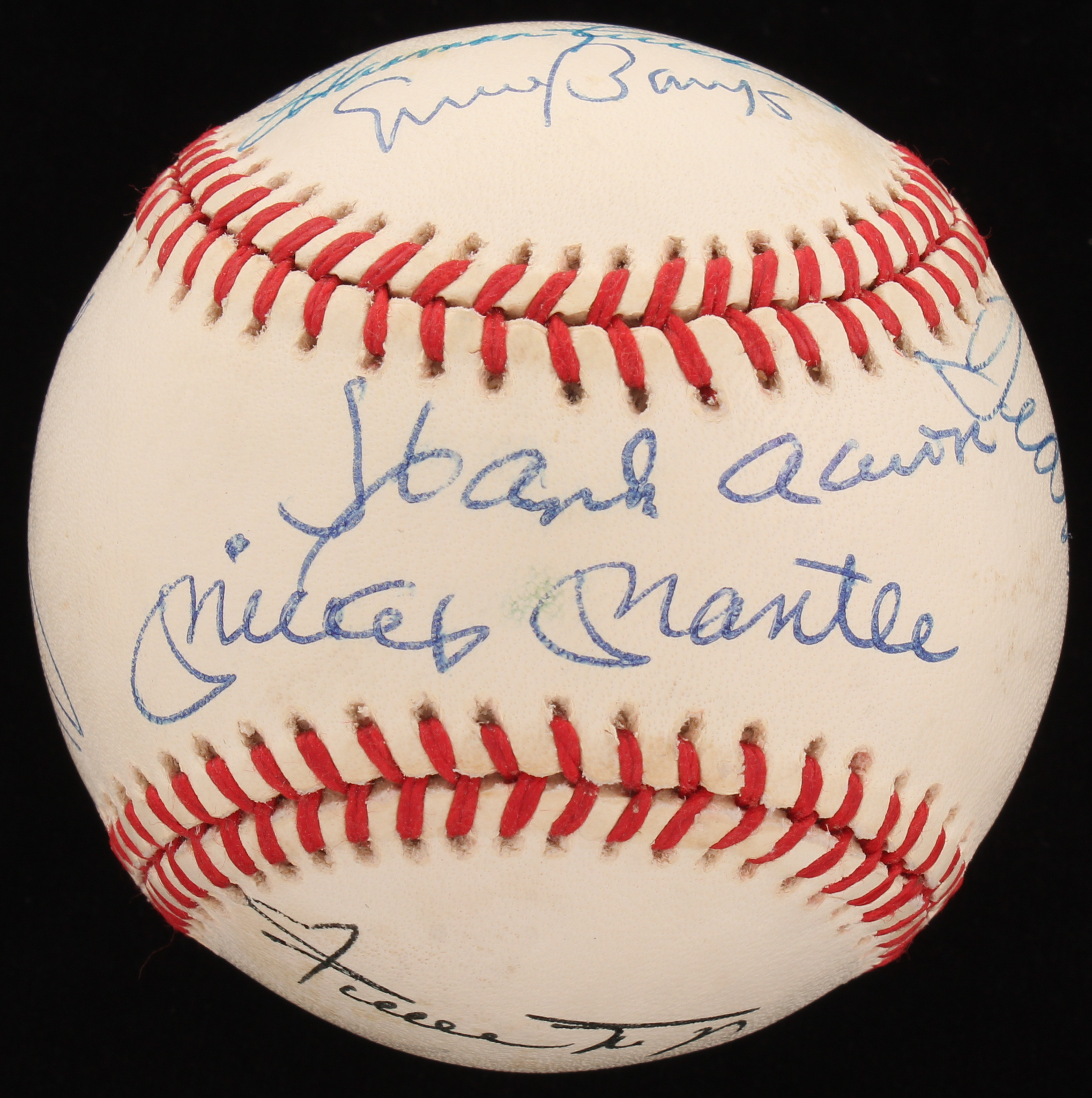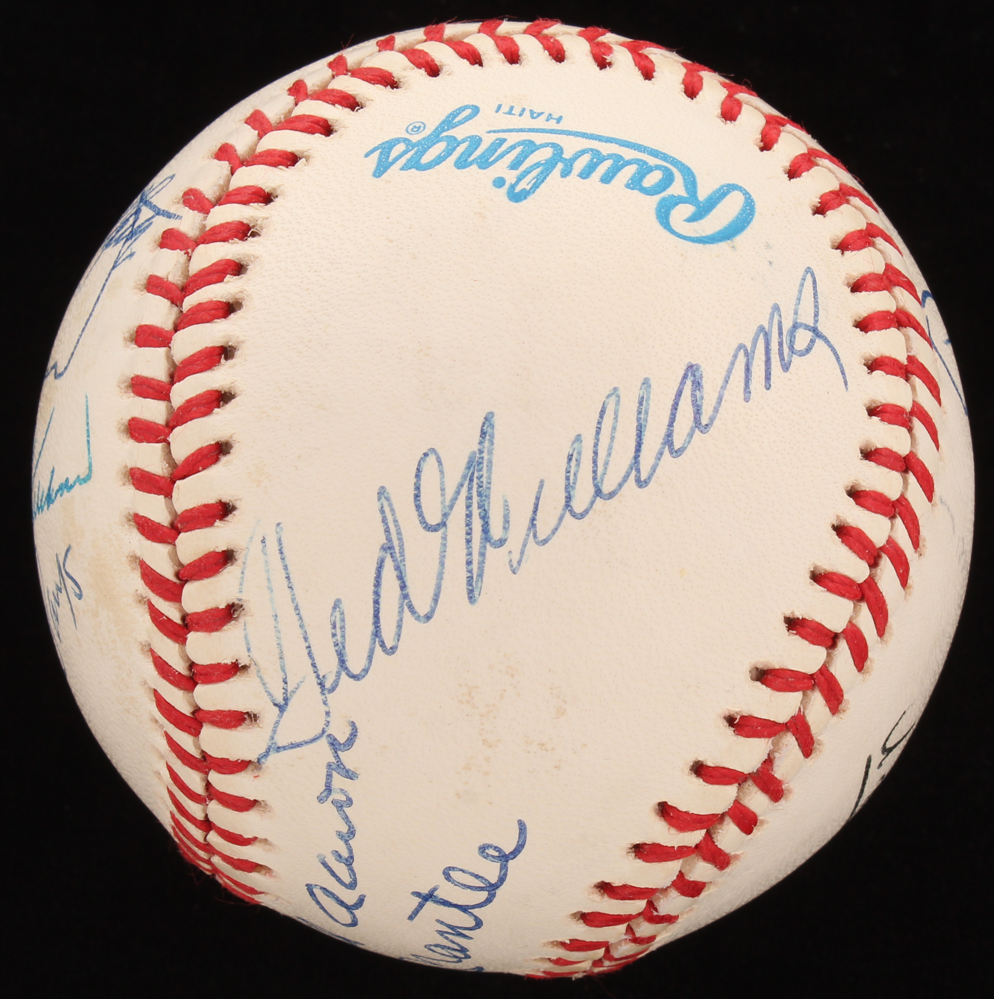 Rawlings Official American League Baseball. Hand-signed in blue and black ink pen by Ted Williams, Mickey Mantle, Eddie Mathews, Reggie Jackson, Frank Robinson, Willie Mays, Harmon Killebrew, Mike Schmidt, Hank Aaron, Ernie Banks, and Willie McCovey. Please see photos for details.