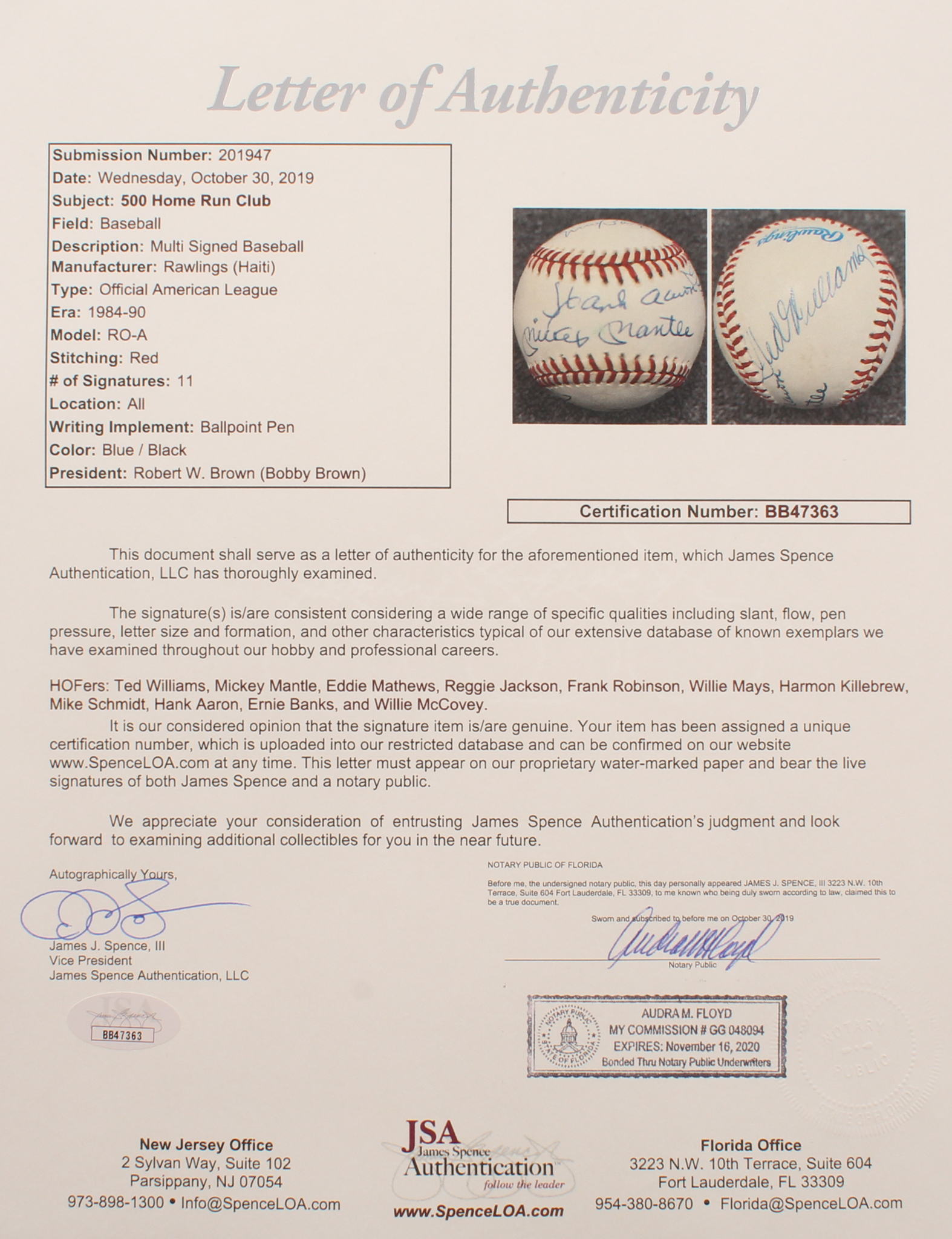 500 Home Run Club OAL Baseball Signed by (11) With Ted Williams, Mickey Mantle, Eddie Mathews, Reggie Jackson, Frank Robinson (JSA LOA)