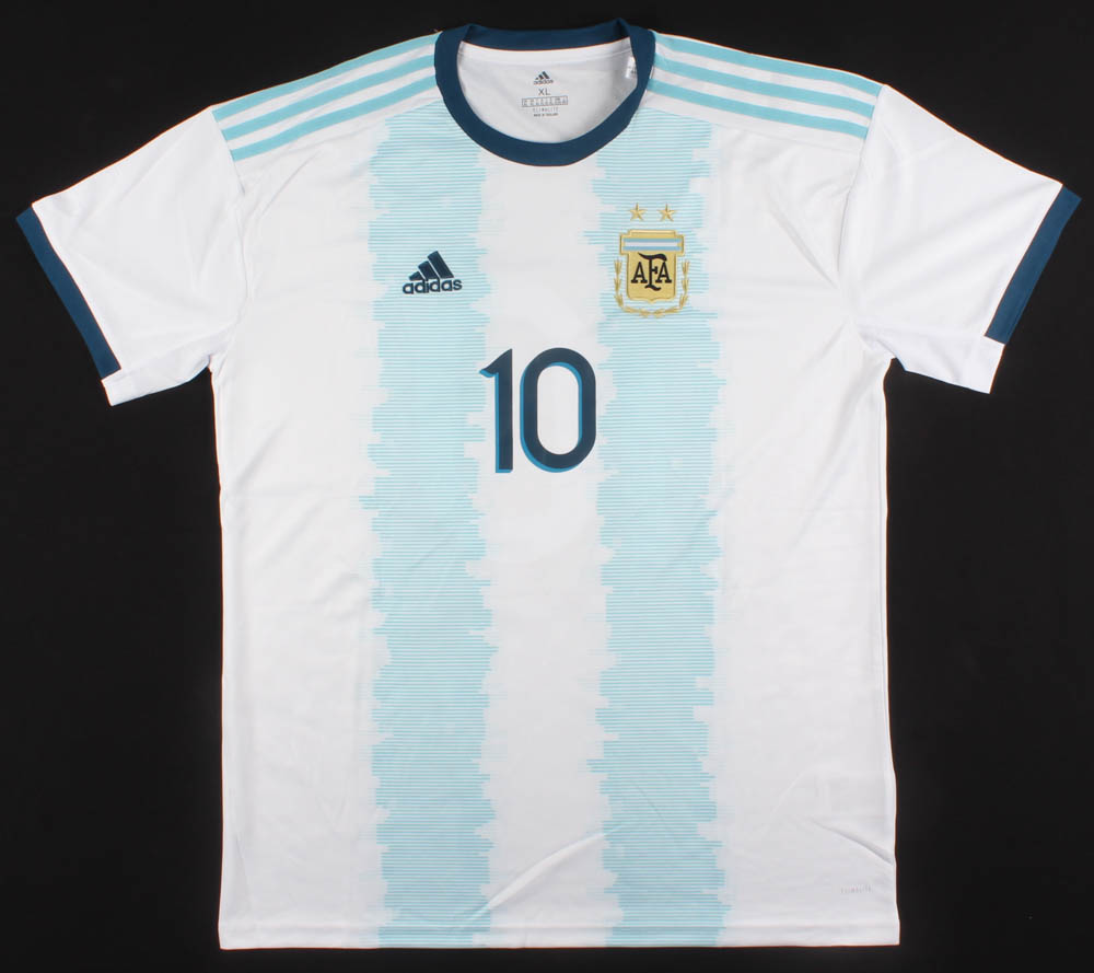 Adidas on-field style jersey. Everything is printed on, size XL. Hand-signed and inscribed in silver paint pen by Lionel Messi.