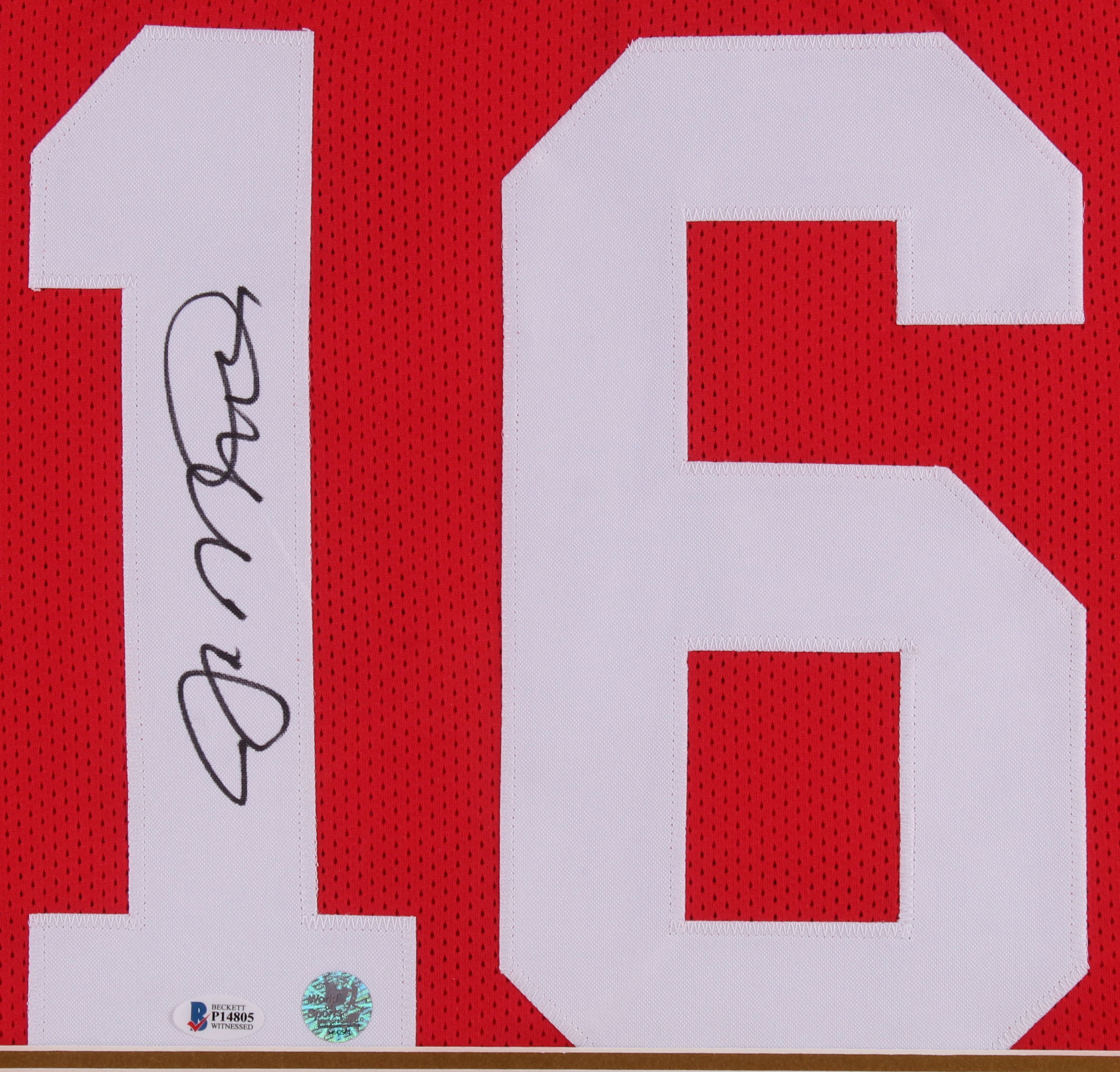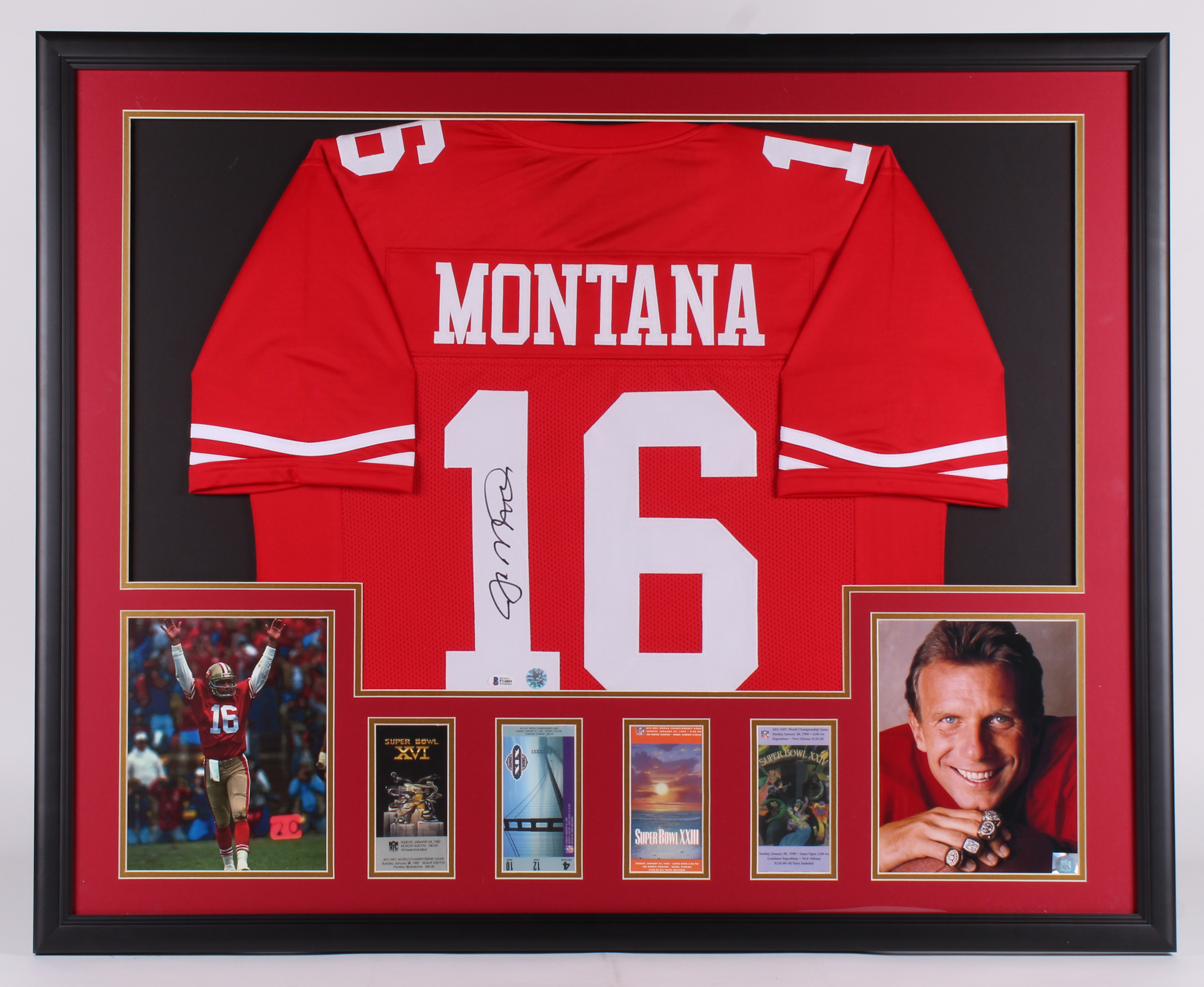 Custom frame measures 34.5" x 42.5" in size and features a jersey that has been hand-signed in black felt-tip pen by Joe Montana (HOF).