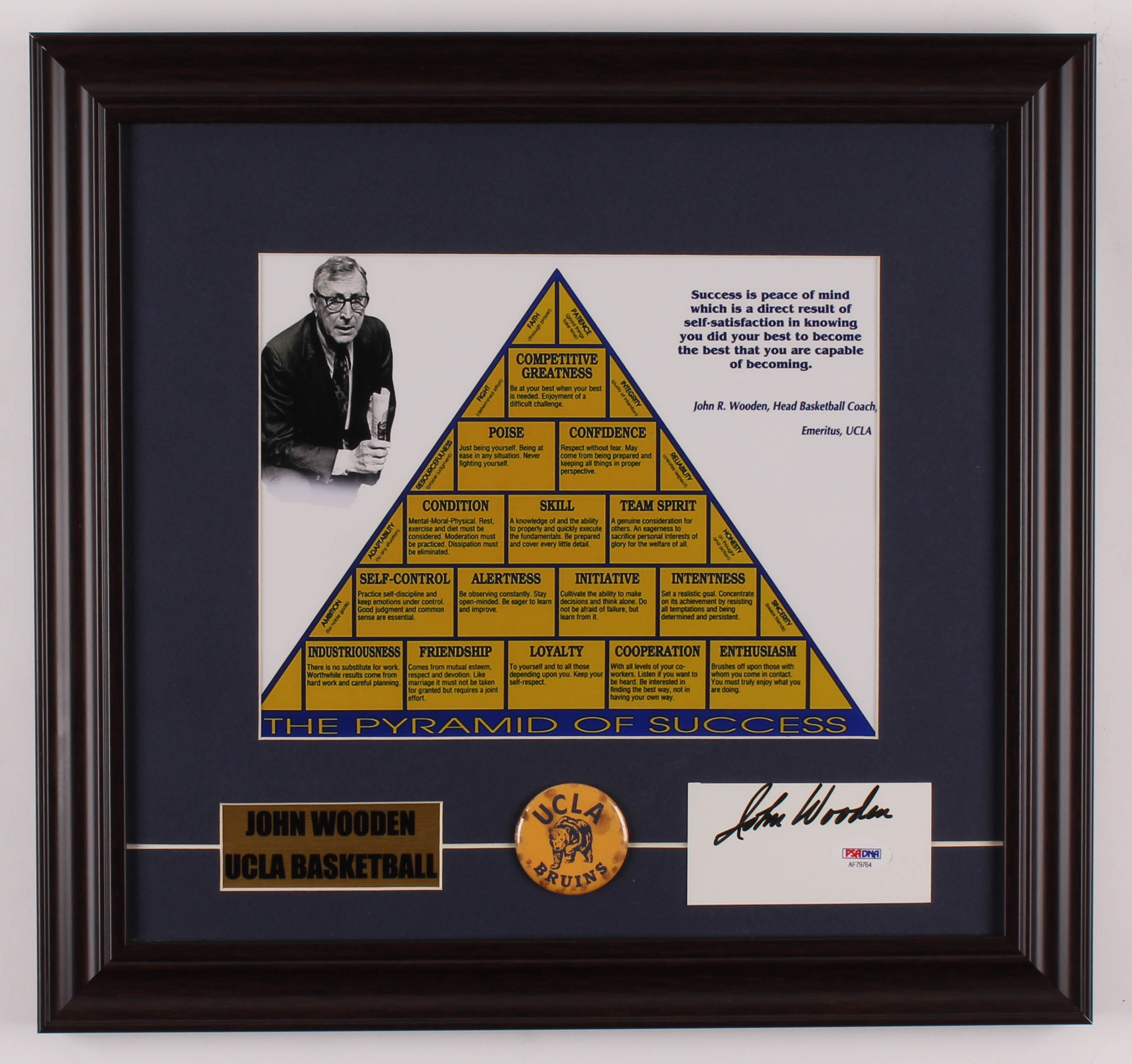 John Wooden Signed "The Pyramid of Success" 15.5x16.5 Custom Framed Cut Display with Vintage UCLA Pin (PSA COA)