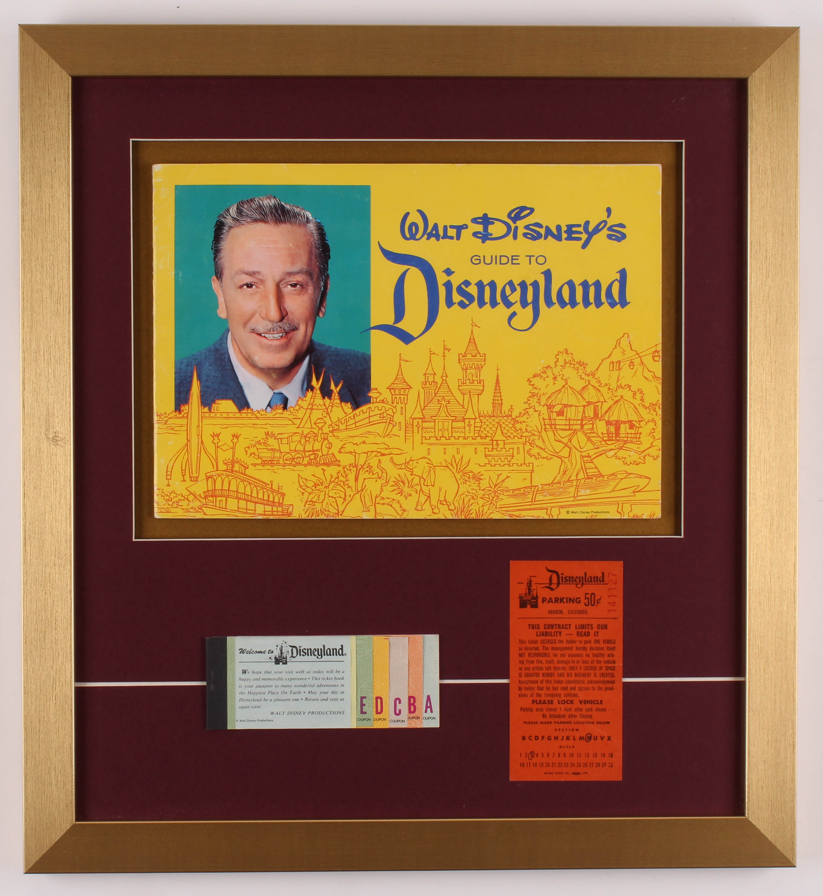 Walt Disney's "Disneyland" 17.5x19 Custom Framed Guide Display with Ticket Booklet & Parking Pass