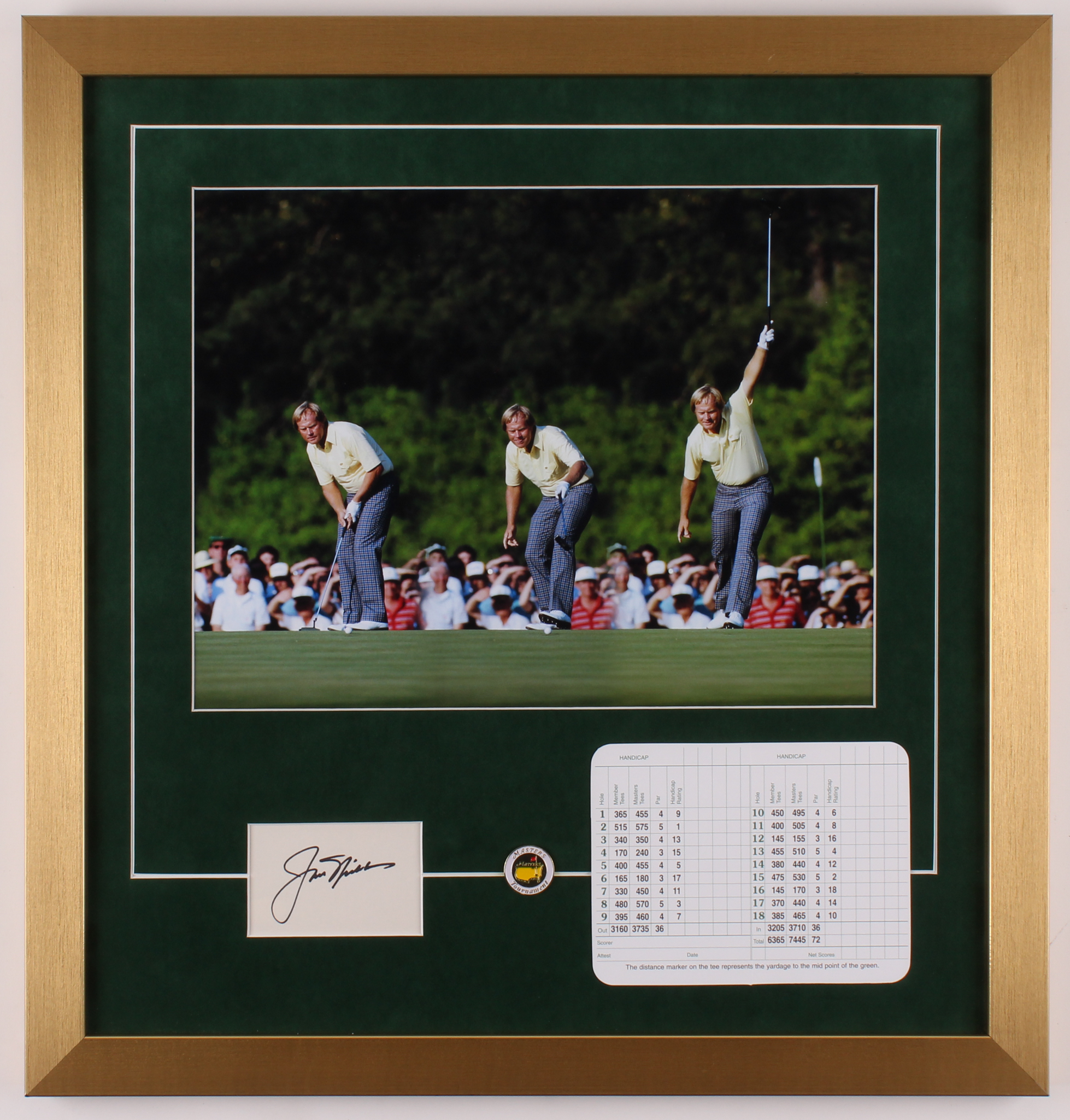 Custom framed display measures approximately 20" x 21" in size and features a cut that has been hand-signed in black felt-tip pen by Jack Nicklaus. Display also includes an official scorecard and pin. Please see photo for details regarding the condition of the display.