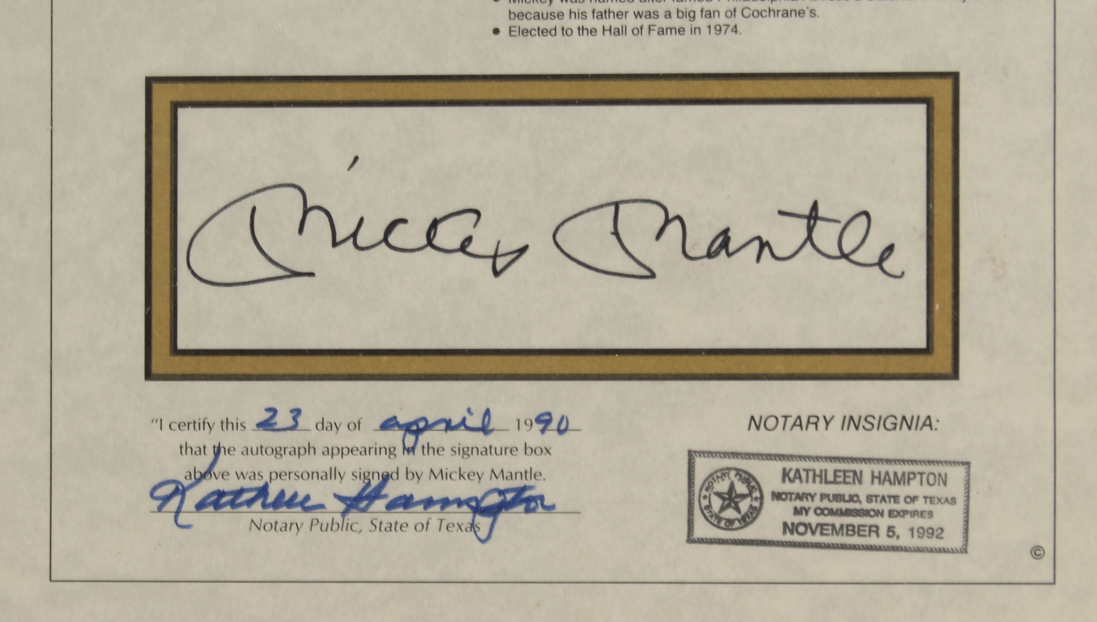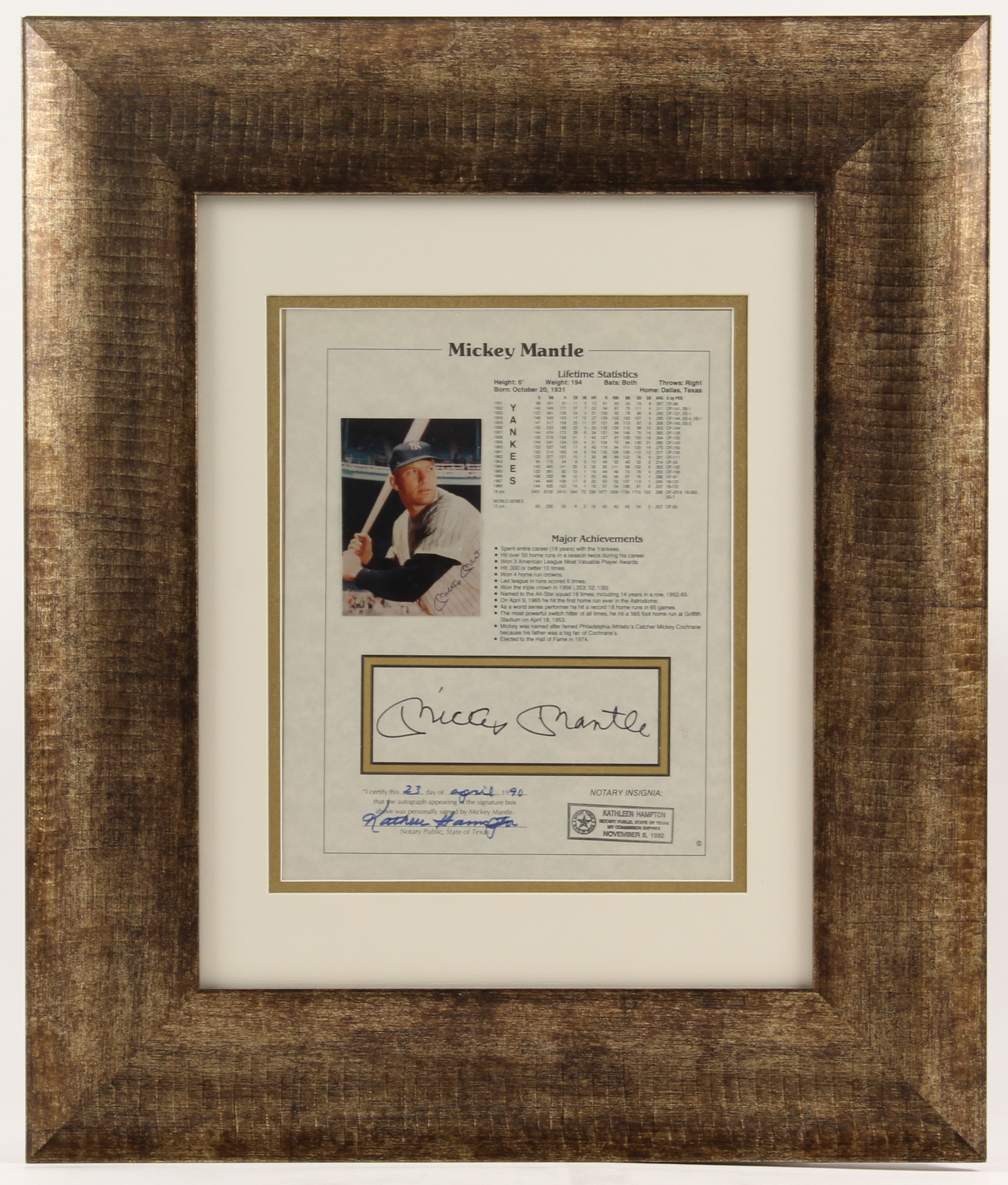 Custom frame measures approximately 16" x 19" in size and features a stat sheet that has been hand-signed in black ink pen by Mickey Mantle (D. 1995, New York Yankees, HOF). Please see photo for details regarding the condition of the frame.