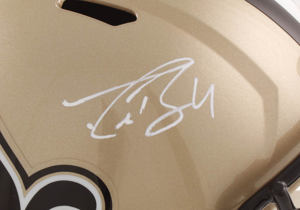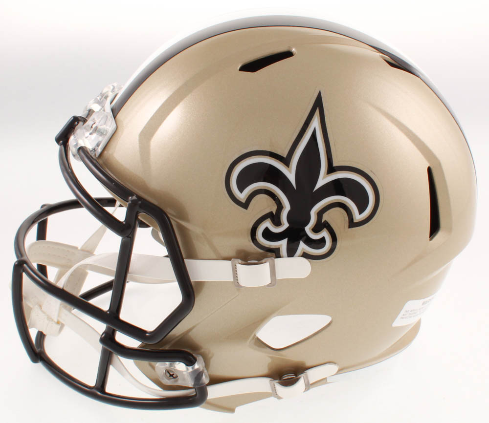 Riddell New Orleans Saints full-size speed replica helmet. Hand-signed in white paint pen by Drew Brees.