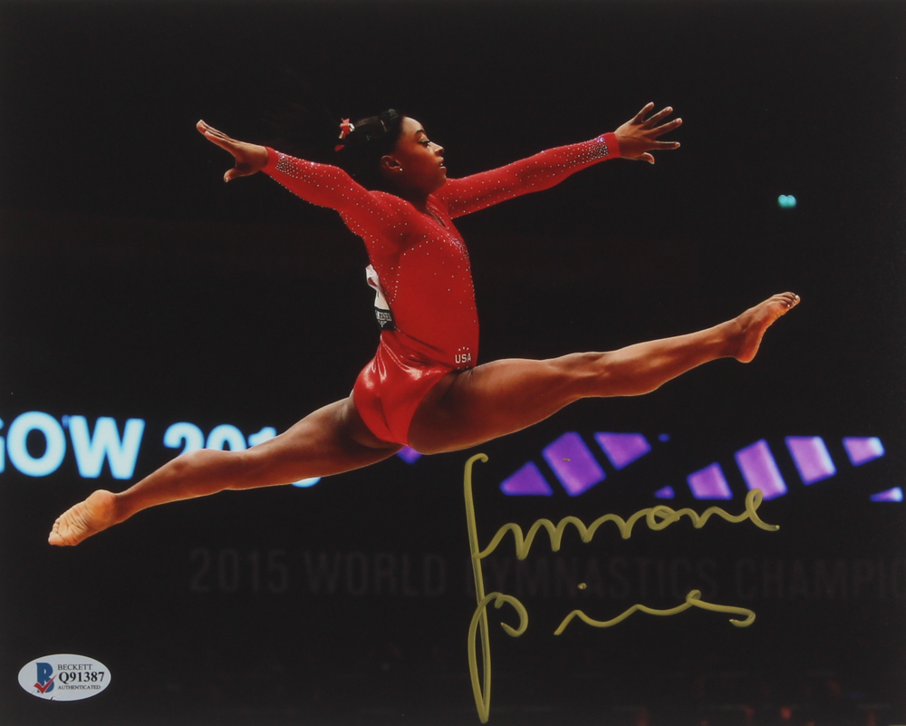 Photo measures 8" x 10" in size and has been hand-signed in gold paint pen by Simone Biles.